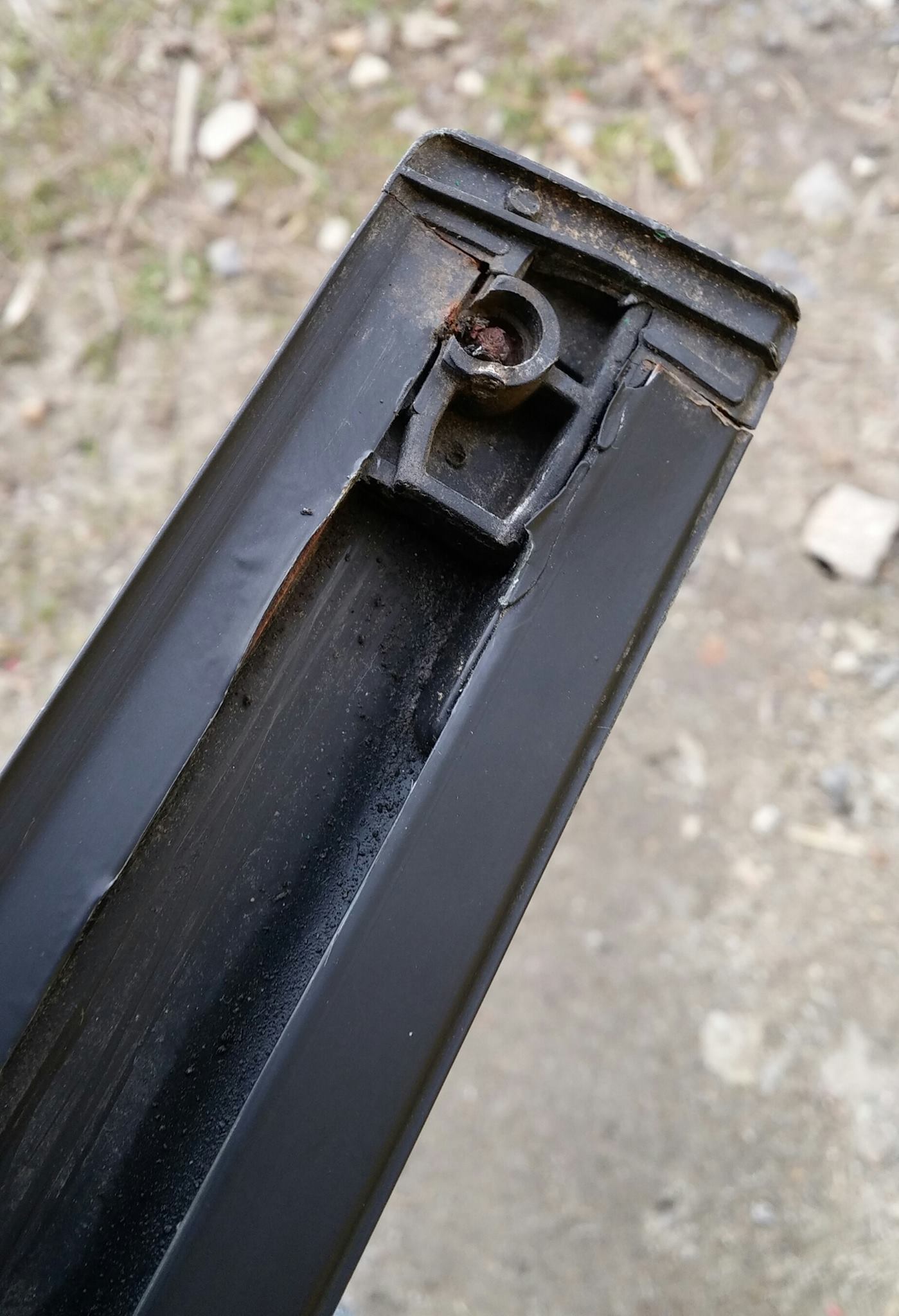 Končíky jsou dole. Je potřeba z toho, co v něm zbyl zbytek železa, ho dostat ven. To šlo celkem v pohodě vydloubnout tou malou dirkou úzkým šroubováčkem a ránou kladívkem.