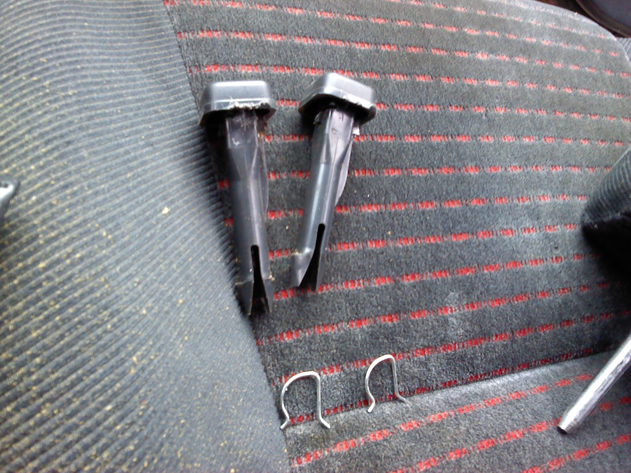 7, teď je zábavnější část a to vyndání závlaček pro opěrku - posadíme se do prostor které nedoporučuji lidem trpící klaustrofobií neboli zpět na zadní sedačku a vezmeme si sebou,plochý šroubovák,malé kleštičky a náhradní balíček nervů do kapsy... závlačky jsou umístěny pod černym plastovym objektem a nejlépe se dá vyndat plochym šroubovákem,kterým zajedete pod plast a z pravé strany je vykousnutá drážka na opěrce a tam lze šroubováčkem zachytit závlačku a vytáhnout