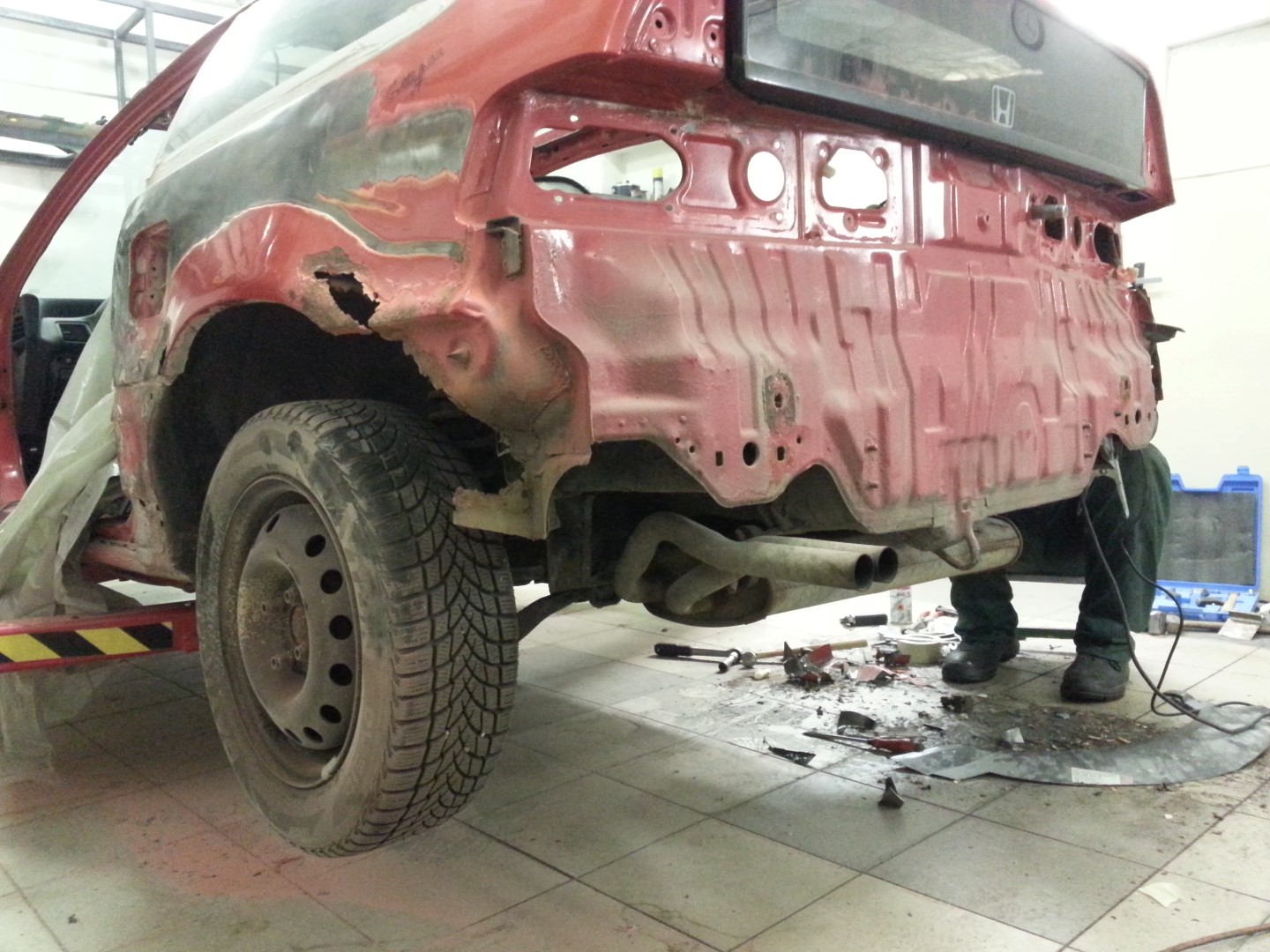 Auto preslo rukami este dvoch klampiarov aby sa dostalo do ako takej podoby. Medzitym, nakolko fuklo tesnenie pod hlavou, sa vybral motor, ze sa trosku upravi hlava, dame nizsie tesnenie aby boli vyssie kompresie, vyportuje sanie a tak, nech trosku dvihneme vykon. Vdaka mojmu velmi dobremu kamaratovi z HAKU Performance ktory rad vyhadzuje peniaze za funkcne blbosti sme sa rozhodli spravit komplet generalku motora. V polovici generalky si on postavil D16Z6 s kompresorom, celkom ma to zaujalo a nadchlo. Prehovoril ma nech to fuknem aj ja, chvilku (cca 10 minut) som sa branil tejto myslienke. Chcel som to po generalke zabehnut ako atmosferu, nech si to pekne sadne, nemal som ani tolko penazi a tak. Po tych desiatich minutach som uz pozeral na internete co stoja kovane ojnice. Prisli kovane ojnice, zistili sme ze potrebujeme ine piesty. Piesty som rovno kupil vybrusove takze zasa spravit vybrus a honovanie bloku a takto to slo dalej a dalej. Stale som vsak myslel ze to zabehneme ako atmosferu az potom kupime turbo a dorobime zvysok. Nie. Po kupeni nizsieho tesnenia pod hlavu by sme sa dostali na kompresie 10:1 takze zasa na zakazku prerobit tesnenie z 0.7mm na 2mm, kompresie su tym padom 9.1 pravdepodobne. Motor sa poskladal a dal do auta, samozrejme po roku sa stratilo asi 200 tisic srobikov tak nastali docasne provizorne riesenia ale je vnutri a drzi.