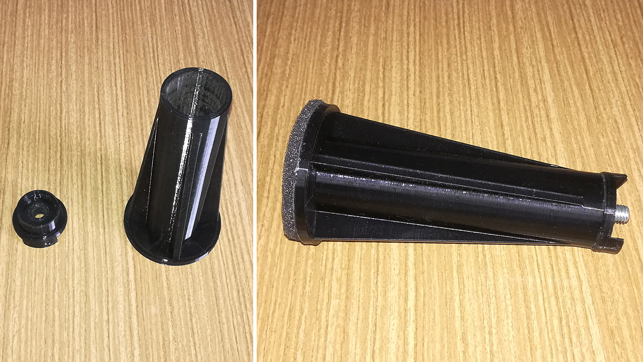 Abych mohl dál plnohodnotně používat kufr a nepropadalo se mi při větším zatížení jeho plastový dno, který normálně sedí na rezervě. Tak sem si navrhnul a na 3D tískárně vytisknul sloupek, který se našroubuje do závitu pro uchycení rezervy a dno na něj pak při zatížení dosedá.
