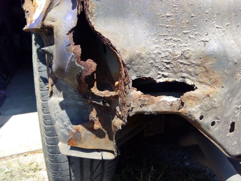 V roku 2015 som doplatil na to ze som auto zanedbaval a znacna korozia sa nemilosrdne zacala drat na povrch. A tak som sa rozhodol ze s tym zacnem nieco robit. Ako prvy som si vzal na musku siber - po otvoreni mi padala hrdza do vlasov a oci a navyse tade zatekalo. Ked som vsak zacal opravovat siber objavil sa iny problem - od zadneho lemu mi odskocil obrovsky kus tmelu a v aute zoatala po hrdzavom plechu len obrovska diera - cely lavy zadny kus pod smerovkou bol pretmeleny velkym mnozstvom tmelu. Teraz uz viem preco bolo auto predoslym majitelom prestriekane do fialovej :evil: