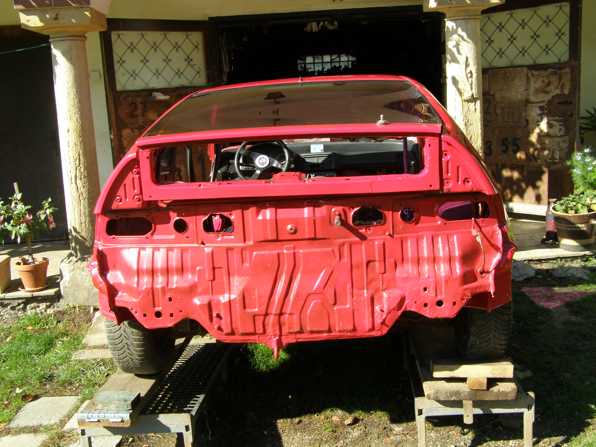 Ještě mě to baví.Teď už mám vlepeny okna(přední prasklo při bouračce,zadní malé svislé jsem musel vyřezat z důvodu koroze v rozích) to jediné mě udělala firma za dobrou cenu(3 tis.)i s předním oknem.Tohle je už moje třetí(proto možná ta cena)původní návrh byl 3 a půl.Abych nekřivdil ještě 1 firma mě pěkně za1400kč opravila přední nárazník (tak,že je origo původní můj)Nádrž jsem měl doma už déle,tak jsem ji vym¨ěnil za za moji pův.,kterou jsem už 2krát svařoval.Od včerejška mám i baterku (původní se rozmáčkla o páku spojky).Udělal jsem dutiny a spodek auta.Nastříkal jsem celé auto,zbývá černá na plasty nárazníků.Repasování brzdičů,plus nové destičky ještě bych měl mít někde nové kotouče zadní.Teď zkusím přidat pár fotek,jestli se mě je podaří posunout do viditelného pole.Na té pslední fotce je ještě starý šíbr i starý nápis na středním panelu.Teď už je vše O.K. Ty dvéře mám ještě brousit a leštit (to víte ty podmínky stříkání doma nejsou ja v boxu) Zatím zdraví Standa.
