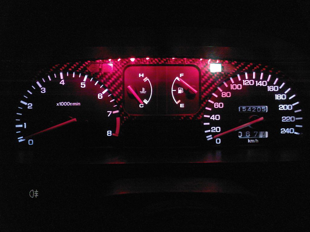 Zatím na hrubo podsvícená přístrojovka. Tachometru si nevšímejte. Z něho někdo sundal zadní polarizační vrstvu, takže svítí jak blázen. V autě bude jiný, který bude svítit jako otáčkoměr. Ledkama jsou nasvícený i ručičky přistrojů. Byla to celkem makačka a jen na nasvícení ruček padlo 10 LEDek, ale vypadá to celkem dobře.