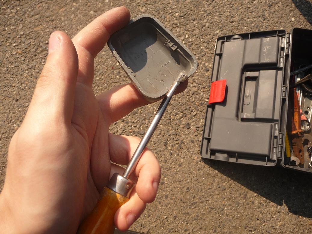 Druhý způsob jak dostat krytku dolů, je použít šroubovák a vsunout ho pod krytku jako je zde na obrázku a opatrně krytku vylomit směrem ven.