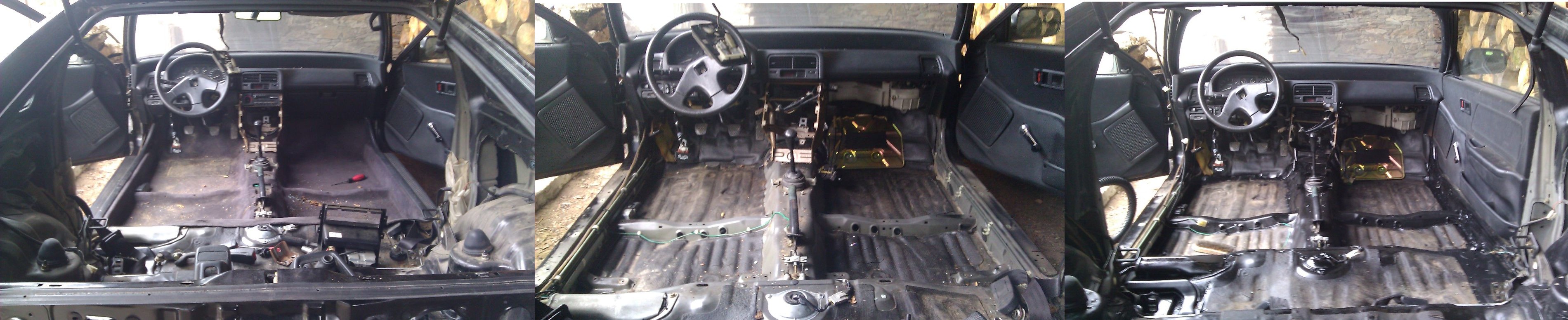 Celkově po sundání koberců a plastů v interiéru pecka... crx uvnitř absolutně bez koroze,takže ošetřeno antikirozkou a hurá pojedeme vařit 1 rezavý prah a lem... Tak zas tu