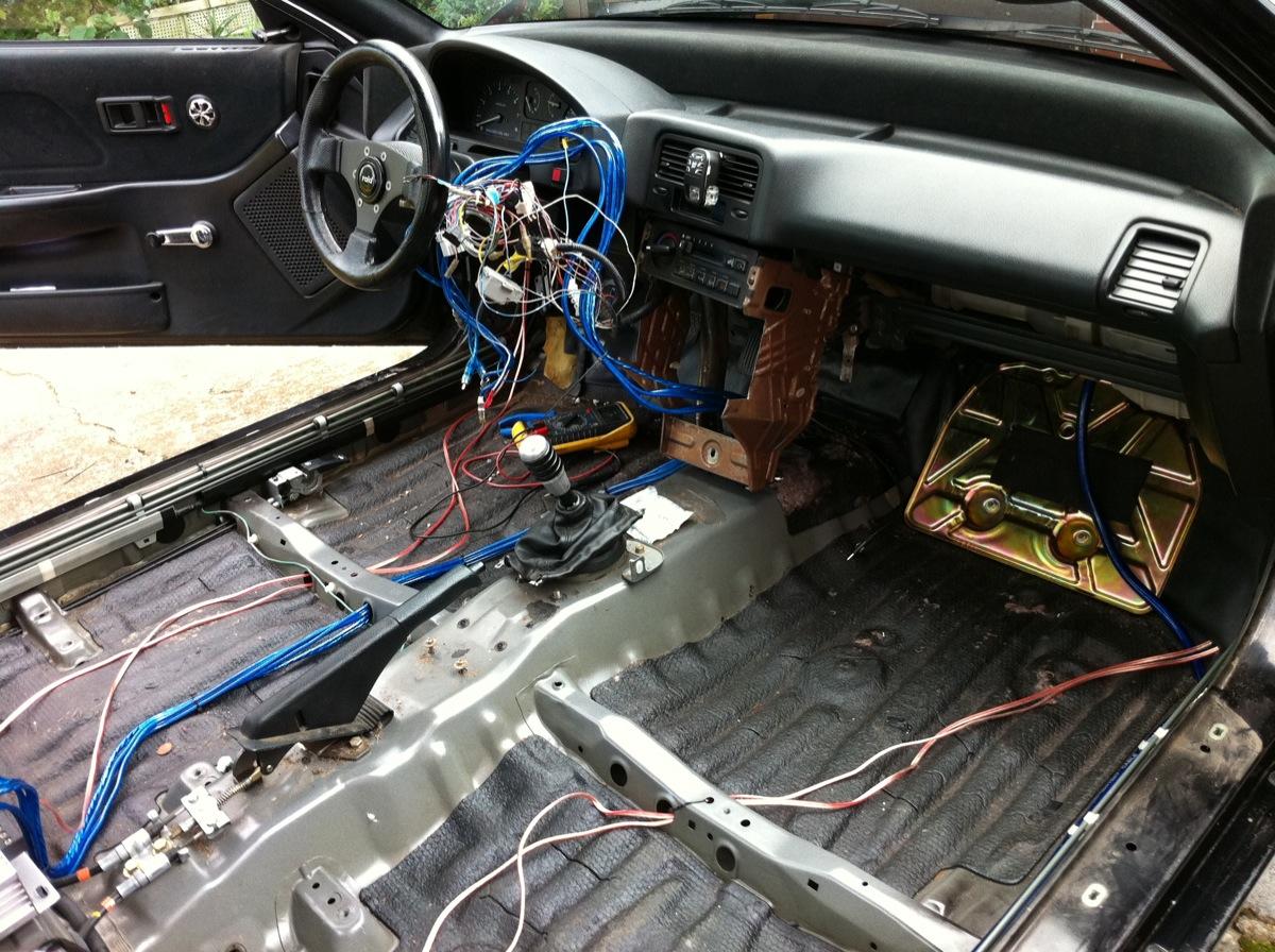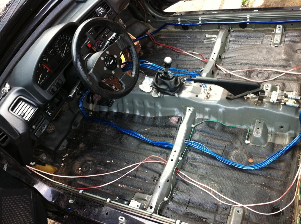 Následovala klacická debordelizace, všechno z interieru šlo ven, koberec a sedačky jsem nechal vytepovat prostě klasika. Do dveří jsem nainstaloval kompa zapojená do aktivu, nové rádio, natahnul jsem 50 ku napájecí kabel a pod zadní sedačku jsem nainstaloval jeden čtyřkanál na přední kompa v aktivu a monoblok na sw, kterej si pobrukuje v kufru. Všechno je krásně skované, tak že nepřispůsobiví nemaj ani šajna, že tam něco je :)