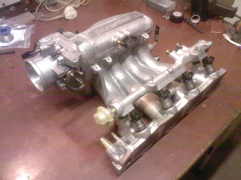 Komora je uvnitř upravená podobně jako předchozí. Jen sem si trochu víc pohrál se zaoblováním přechodů. Na vstupu je zase B16A1 klapka (58mm). Z klapky a EACV sem odstranil vyhřívání, aby mi to zbytečně nezahřívalo celou komoru (doufám, že to v zimě nebude zatuhávat). Palivová lišta je pak osazená 450cc vstřiky z mitsubishi eclipse.
