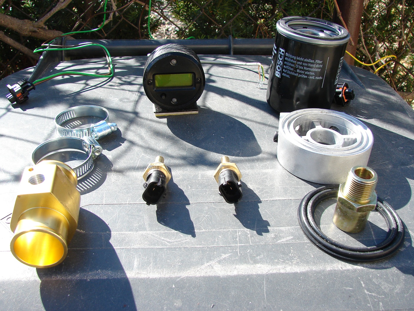 Takže se vypustila voda, rozřízla se přívodni hadice, z ní se kus odřízl a vložil se mezikus s čidlem.Dal jsem jej max 15cm od konce hadice u chladiče a nasměroval čidlo ke svazku drátů předních mlhovek s tím, že společně s ním povede i kabelaž od čidla.Dále jsem vypustil olej, odšrouboval filtr a začal s montáží sendviče.Tento mezikus je stáhnuty šroubem, který má na jednom konci vnitřní a na druhém venkovní závit.Takže se přidrží mezikus s těsněním a přitáhne koncem s vniřním zavitem.Jenže ouha, šroub na konci závitu a sendvič stále volny.Takže troška měřeni a rozhodnutí o zkrácení šroubu ze strany vnitřního závitu o 5mm to vyřešilo.Důkladně očistit, vyfoukat a zpět montovat...........aaaano zadařilo se.Ještě vymyslet natočení sendviče, aby nezavazelo čidlo, konečné dotahnutí a montáž nového filtru na venkovní závit.Tady bych dodal, že jsem doposud dával vždy jenom a pouze olej. filtr BOSH P2036, ale jeho venkovni průměr přesahoval o cca 5mm na každou stranu pres sendvič.Takže jsem zvolil trošku menší filtr BOSCH P2041.Nejspíš by to nedělalo neplechu, protože těsnící část je uplně stejná, ale takto vypadá líp a je i o neco kratší.Dále natáhnout ochranný "husí krk" za kabeláž, zapojit čidla a pustit se do spojování kabeláže.Nejsem žadný odborník, ale jistou představu jsem měl a po pár dotazech, zda to tak smím provést, jsem se do teho pustil.Zdroj i kostru jsem vzal u zapalovače, abych splnil podmínku-přívodu proudu až na zaplé zapalování.Vše bylo hotovo, takže zkouška.....k mému udivu se vše povedlo napoprvé a s vekým úžasem jsem sledoval oznamováni displeji.