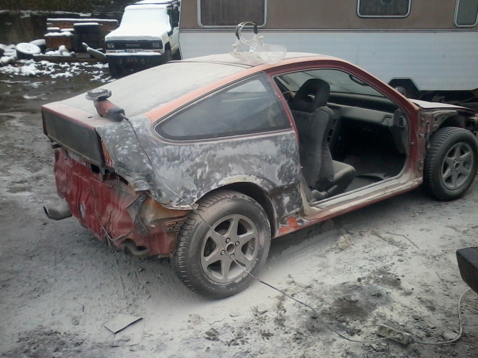 Ne Kabrio neeee. Bude to normalni original. Jinak dnes jsem z toho sundal ty laminaty a prisaham bylo tam 50-60kg kitu na prednich blatnikach bylo temer po cele plose od 0,5 do 4 cm kitu normalne jsem to cele strhnul a na pravem zadnim platniku od 0,5 do 6 cm kitu fakt hruza. Bohuzel zadni blazniky jsou fakt silene zdevastovany takze jsem vcera koupil darce organu od Feguta puvodne jsem myslel ze bych to stavel na jeho kastli ale zadni naprava je o 3cm hnuta a tak radsi predelam blatniky. No on i ten predek je katastrofa viz foto