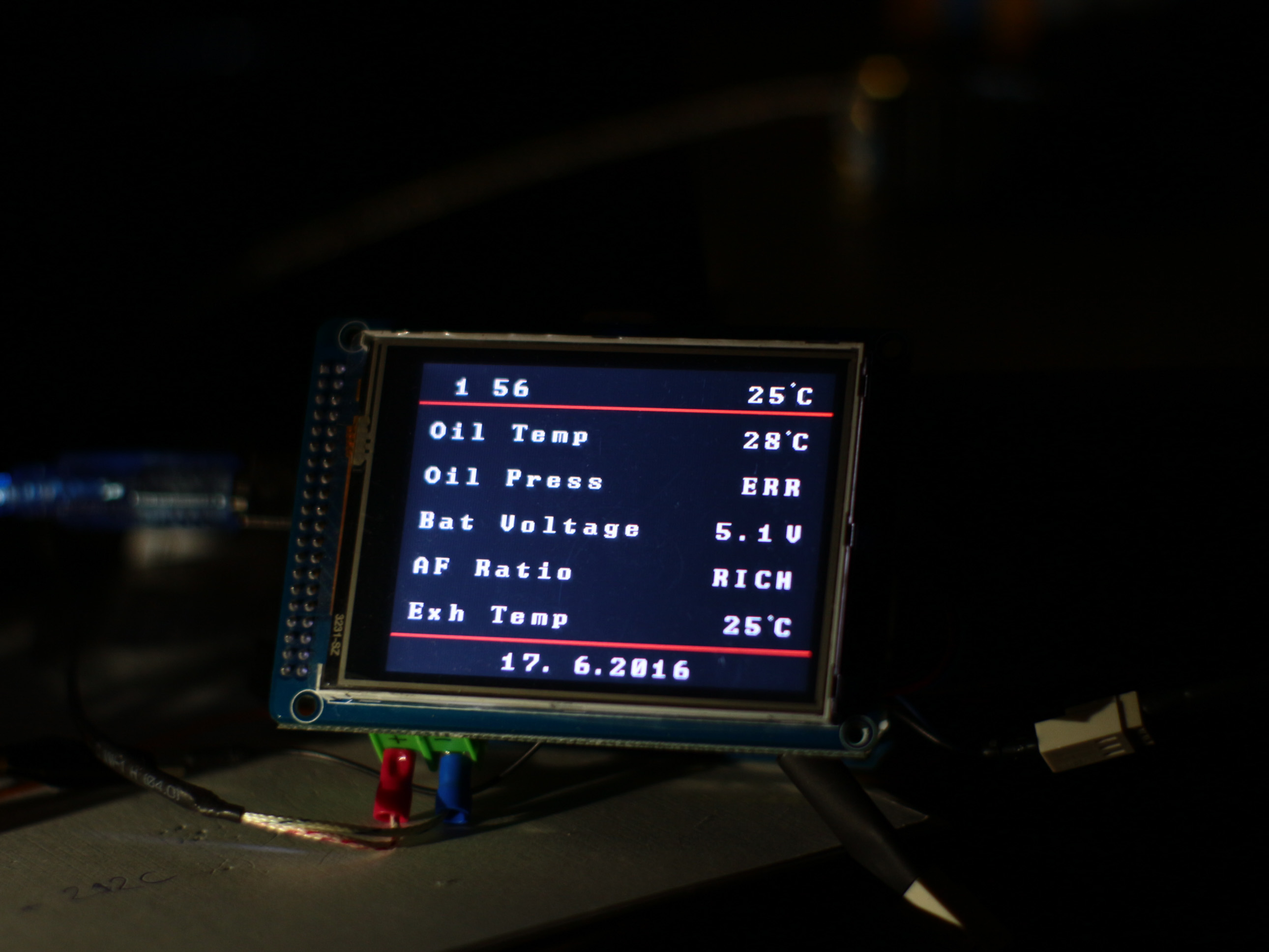 Prototyp ktory som mal ako bakalarku uz je vonku, bol to skorej pokus, ktory zobrazuje cas a datum, 5 hodnot z roznych cidiel, je to prerobene na dotykovy displej pre eliminaciu HW tlacidiel kvoli jednoduchosti.