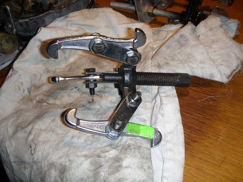 Na sundání ložiska potřebujeme stahovák. Ten, který jsem si koupil a který vidíte na fotce, vám bude úplně na nic. Naštěstí mám šikovného a ochotného kamaráda jménem Pako, který mi vyrobil stahovák ne tak vzhledný, ale o to funkčnější. Sundáme základní desku a ložisko stáhneme. Připravíme si nové (vnější průměr 28, vnitřní 12mm, výška 8mm) a kvůli snadnějšímu nalisování dáme hřídel na deset dvacet minut na mrazák.