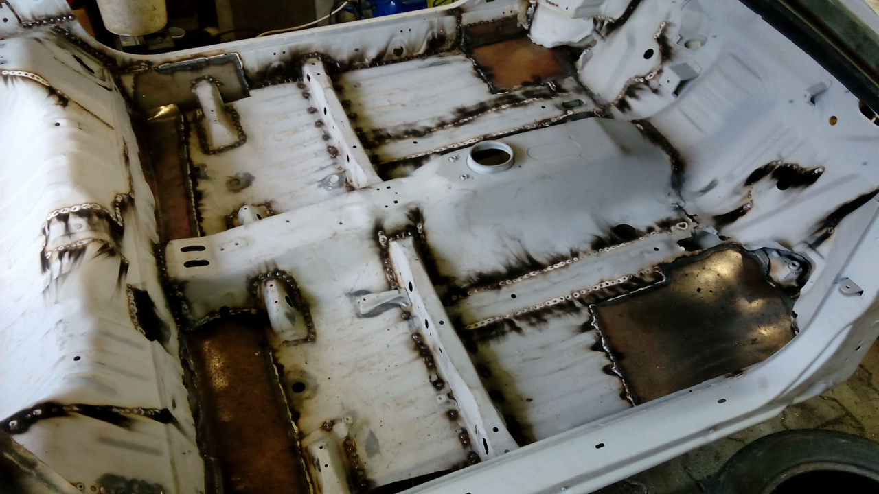 A jak jsem spokojen s prací? Byla chyba jí nechávat stříkat. Věřim tomu, že většina borců co tam přiveze káru jí po otryskání, nalakování začnou vyvařovat. Trochu odrbou barvu okolo místa co vaří a pohoda jahoda. Jenže když chcete probodovat všechny spoje, kde se dotýkaj plechy, tak už to s tou barvou neni to pravé ořechové. Jdou dělat bodové sváry, ale ... Takže v mém případě to byla blbost a druhá věc proč jí nenechat nastříkat je ta, že pak nepoznam, kde co otryskal a neotryskal. Říkal jsem borcovi, ať mi hlavně otryská zrezlá místa, všechny spoje plechů a plochy co jsou OK, tak může nechat. Jelikož jsem s bodovejma svárama s příměsí barvy nebyl spokojen, tak jsem vzal kartáč a odrbal pár míst. A co jsem nezjistil. Po odstranění nástřiku tam byl ještě původní nástřik plechu z fabriky