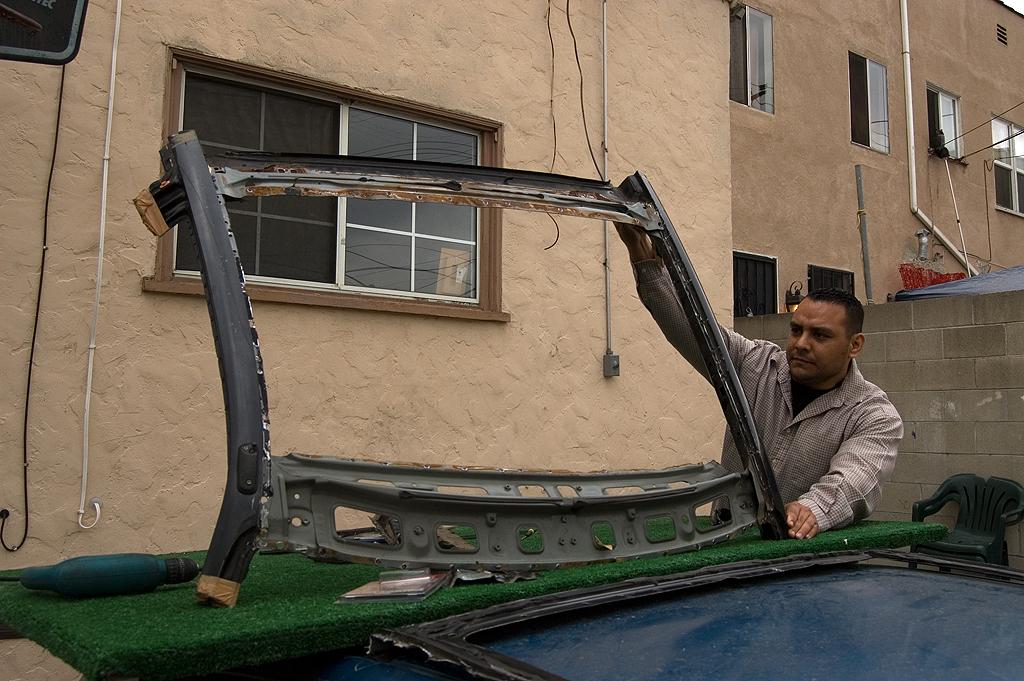 Nejprve musíme dostat konstrukci skleněné střechy od konstrukce auta...Dostat se milence pod spodní část ošacení, není zrovna nejlehčí. Podle slov majitele, tuto činnost od výroby ve fabrice ještě nikdo neprováděl, tudíž byla dotyčná ještě panna a spoje mezi spodním prádlem a nahotinou opravdu držely :D *oprava*