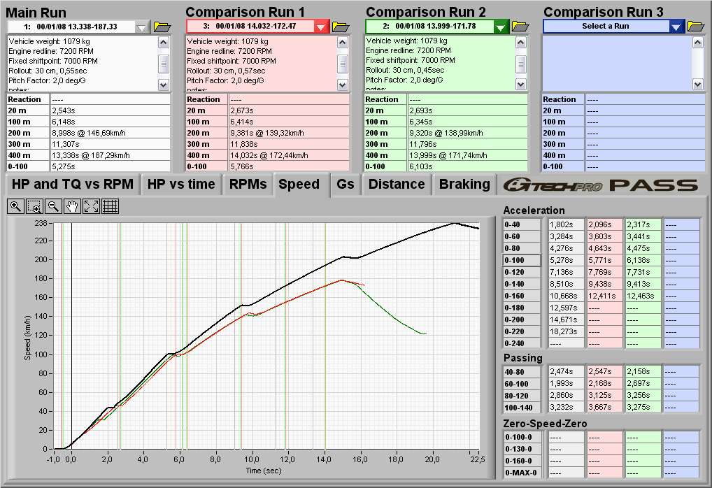 Dneska sem udělal pár dalších měření zrychlení pomocí gtechu. První měření je na rovině (část prvního grafu, která je nad 140km/h prosím berte s rezervou, pravděpodobně odchylka měření gtechu) druhá dvě do mírného stoupání. No a nakonec tu mám i jedno video, točený za sucha, který trochu líp ukazuje co auto dokáže.