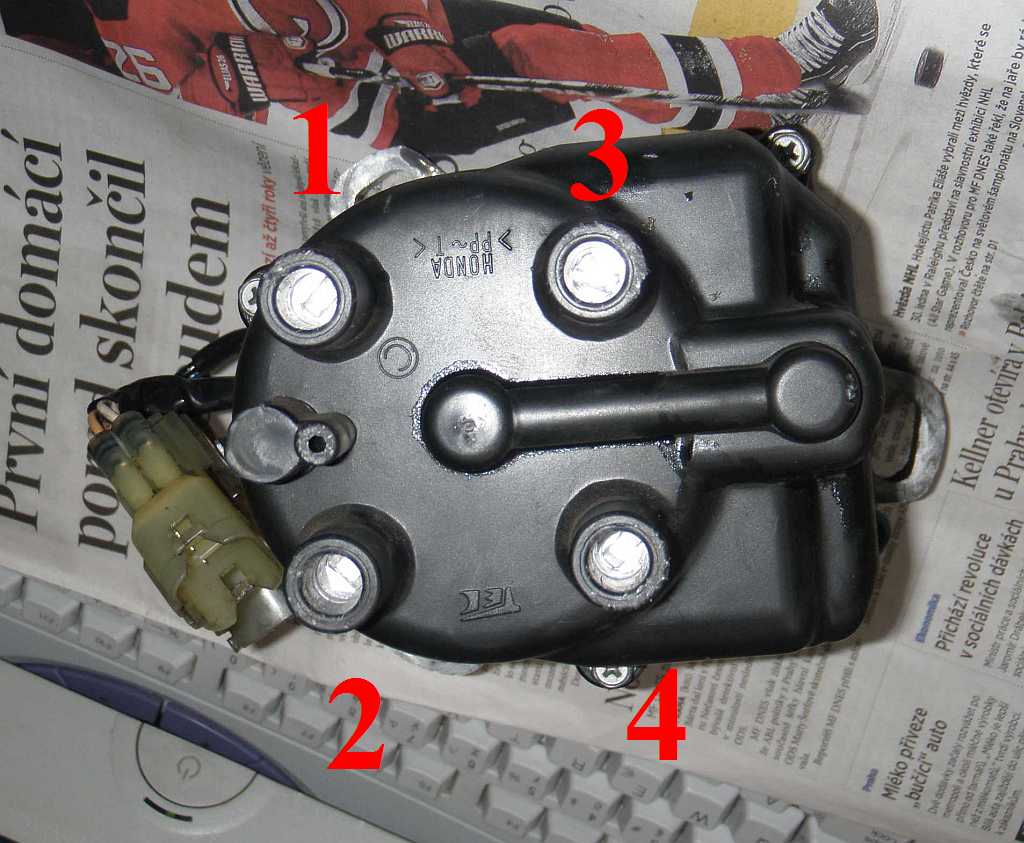 Kabel č. 1 patří (ne vždy, ale zde mluvíme o motoru crx DOHC, takže ostatní možnosti uvádět nebudu) do zdířky, která má u sebe označení C (v kroužku). Je to víceméně levý horní vývod, pokud se díváme na namontovaný rozdělovač jakoby seshora, na víčko s vývody. Kabely pak zapojujeme po chodu hodinových ručiček v pořadí 1-3-4-2 - viz obrázek.