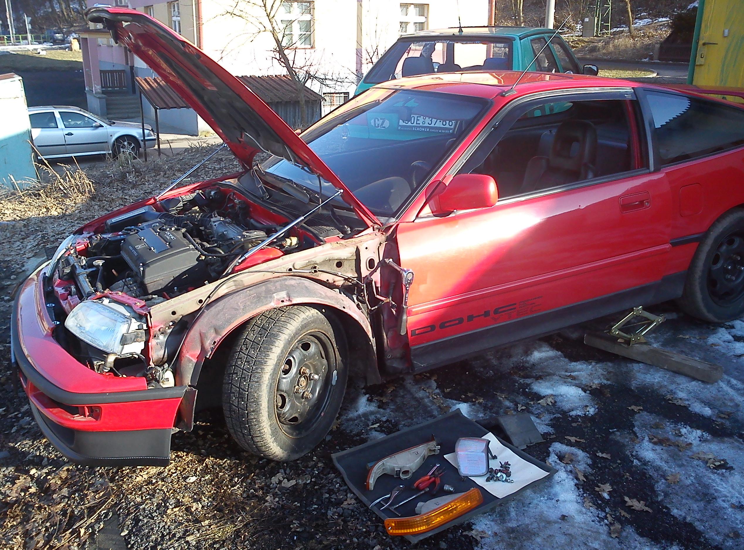 tak jsem vytáhl červenku a pustil se do oprav. Chtěl jsem toho zvládnout mnohem víc ale zahnala mě domů zima, únava a hlad, takže jsem stihl pouze dopasovat dveře u řidiče, což je primitivní záležitost ale když se kuli takový jednoduchosti musí rozebrat blinkry, pozičky, nárazník, kryt prahu, plynové vzpěry, podběh a ve finále blatník tak se mi do toho 2x moc nechtělo ale aspoň už to mam z krku. Při tý příležitosti jsem si i vyměnil originál staré šroubky za originál nový a vyměnil žárovičky v bočních blinkrech za ledkový, zkoušel jsem tam dát bílí ale to hodně prosvítalo tak jsem zkusil oranž a vypadá to dle mě daleko líp. Dokonce jsem si konečně vzpomněl na křídlo které už hodně dlouho slibuju členovi chosse.j kterému se chci omluvit za svojí děravou hlavu crx EE8 Vtec B16A1