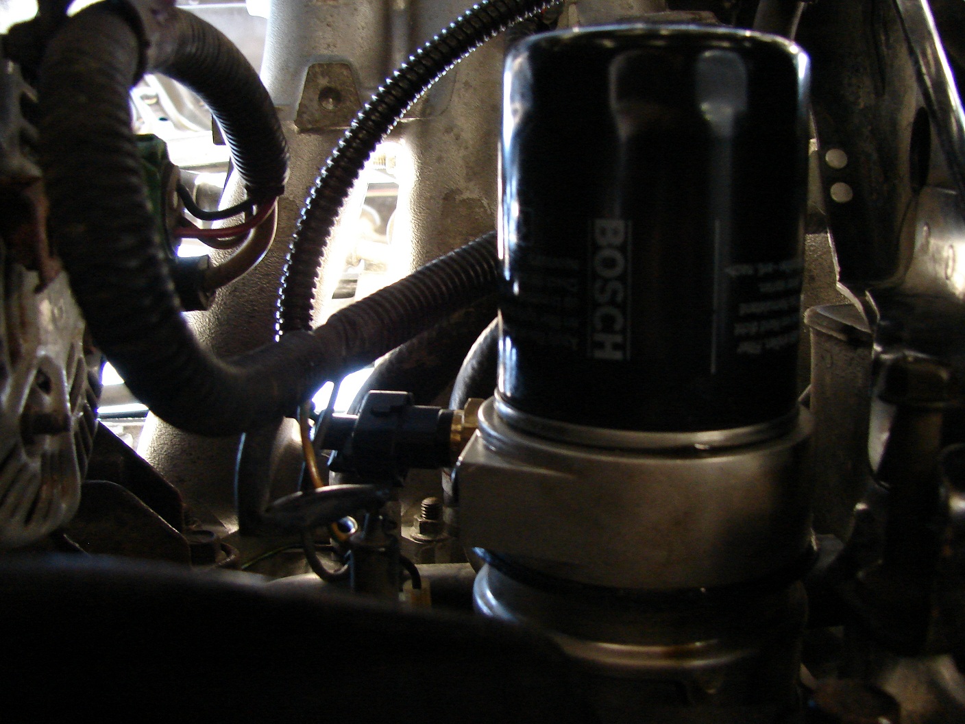 Takže se vypustila voda, rozřízla se přívodni hadice, z ní se kus odřízl a vložil se mezikus s čidlem.Dal jsem jej max 15cm od konce hadice u chladiče a nasměroval čidlo ke svazku drátů předních mlhovek s tím, že společně s ním povede i kabelaž od čidla.Dále jsem vypustil olej, odšrouboval filtr a začal s montáží sendviče.Tento mezikus je stáhnuty šroubem, který má na jednom konci vnitřní a na druhém venkovní závit.Takže se přidrží mezikus s těsněním a přitáhne koncem s vniřním zavitem.Jenže ouha, šroub na konci závitu a sendvič stále volny.Takže troška měřeni a rozhodnutí o zkrácení šroubu ze strany vnitřního závitu o 5mm to vyřešilo.Důkladně očistit, vyfoukat a zpět montovat...........aaaano zadařilo se.Ještě vymyslet natočení sendviče, aby nezavazelo čidlo, konečné dotahnutí a montáž nového filtru na venkovní závit.Tady bych dodal, že jsem doposud dával vždy jenom a pouze olej. filtr BOSH P2036, ale jeho venkovni průměr přesahoval o cca 5mm na každou stranu pres sendvič.Takže jsem zvolil trošku menší filtr BOSCH P2041.Nejspíš by to nedělalo neplechu, protože těsnící část je uplně stejná, ale takto vypadá líp a je i o neco kratší.Dále natáhnout ochranný "husí krk" za kabeláž, zapojit čidla a pustit se do spojování kabeláže.Nejsem žadný odborník, ale jistou představu jsem měl a po pár dotazech, zda to tak smím provést, jsem se do teho pustil.Zdroj i kostru jsem vzal u zapalovače, abych splnil podmínku-přívodu proudu až na zaplé zapalování.Vše bylo hotovo, takže zkouška.....k mému udivu se vše povedlo napoprvé a s vekým úžasem jsem sledoval oznamováni displeji.