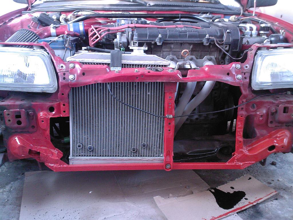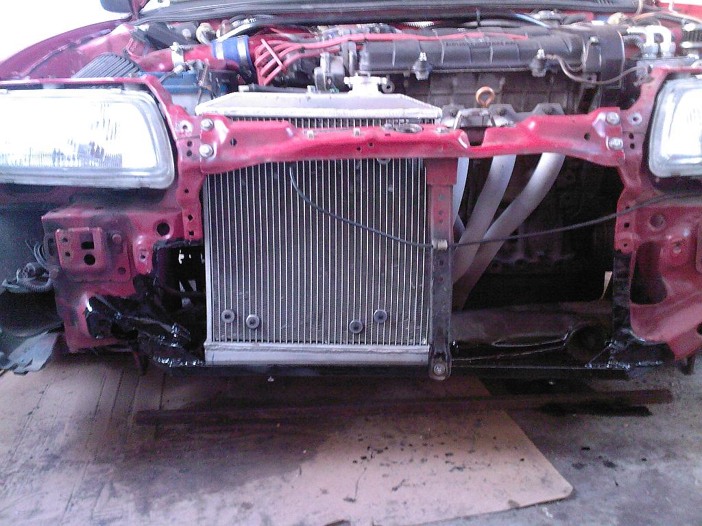 Tak po nějakých 18 hodinách čistý práce je chladič na místě. Ještě mi teda chybí udělat horní uchycení a nastrojit zpátky předek auta, ale to už je maličkost