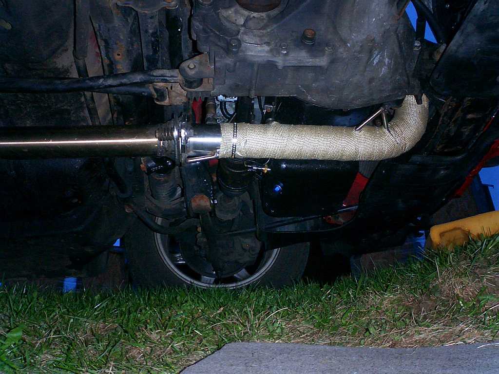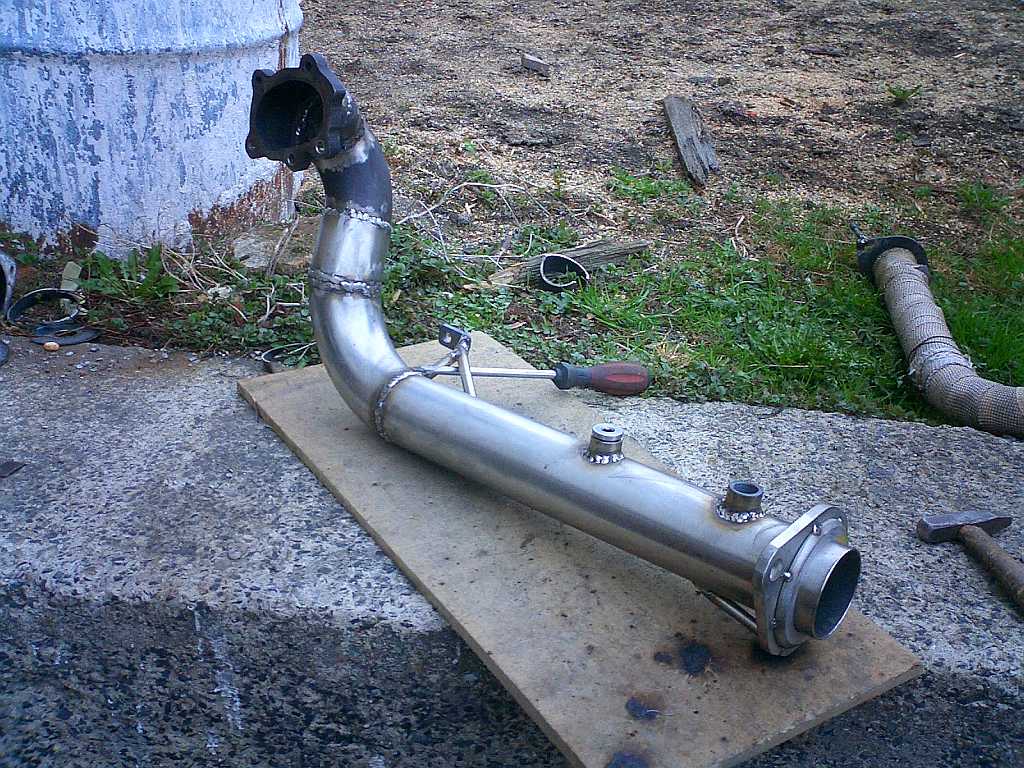 Přírubu a jedno koleno sem použil z původní downpipe, kterou sem koupil s turbem. Musel sem ten celek sice komplet rozřezat a převařit, aby to páslo, ale nakonec se to dalo použít. Zbytek downpipe sem pak svařil z nových trubek. Za přírubou by se mi víc líbil trochu pozvolnější ohyb dolů, ale kvůli nedostatku místa to už líp udělat nešlo.