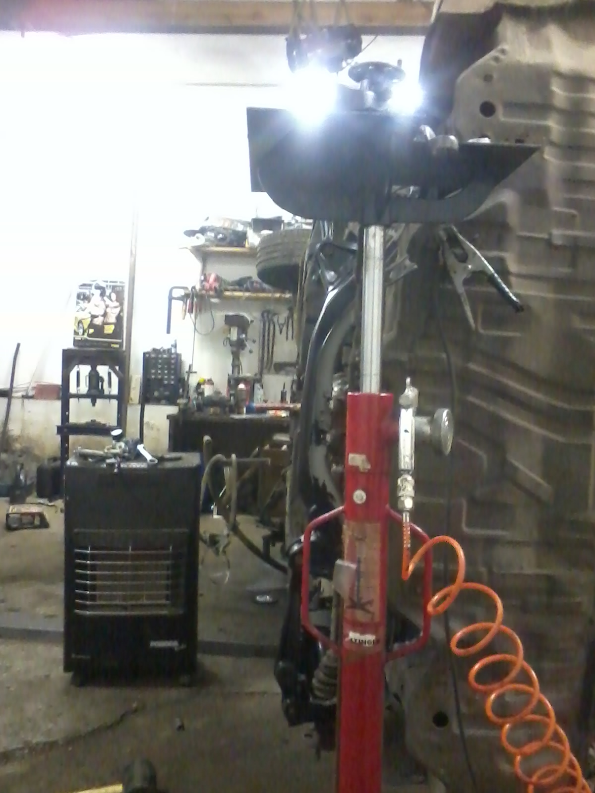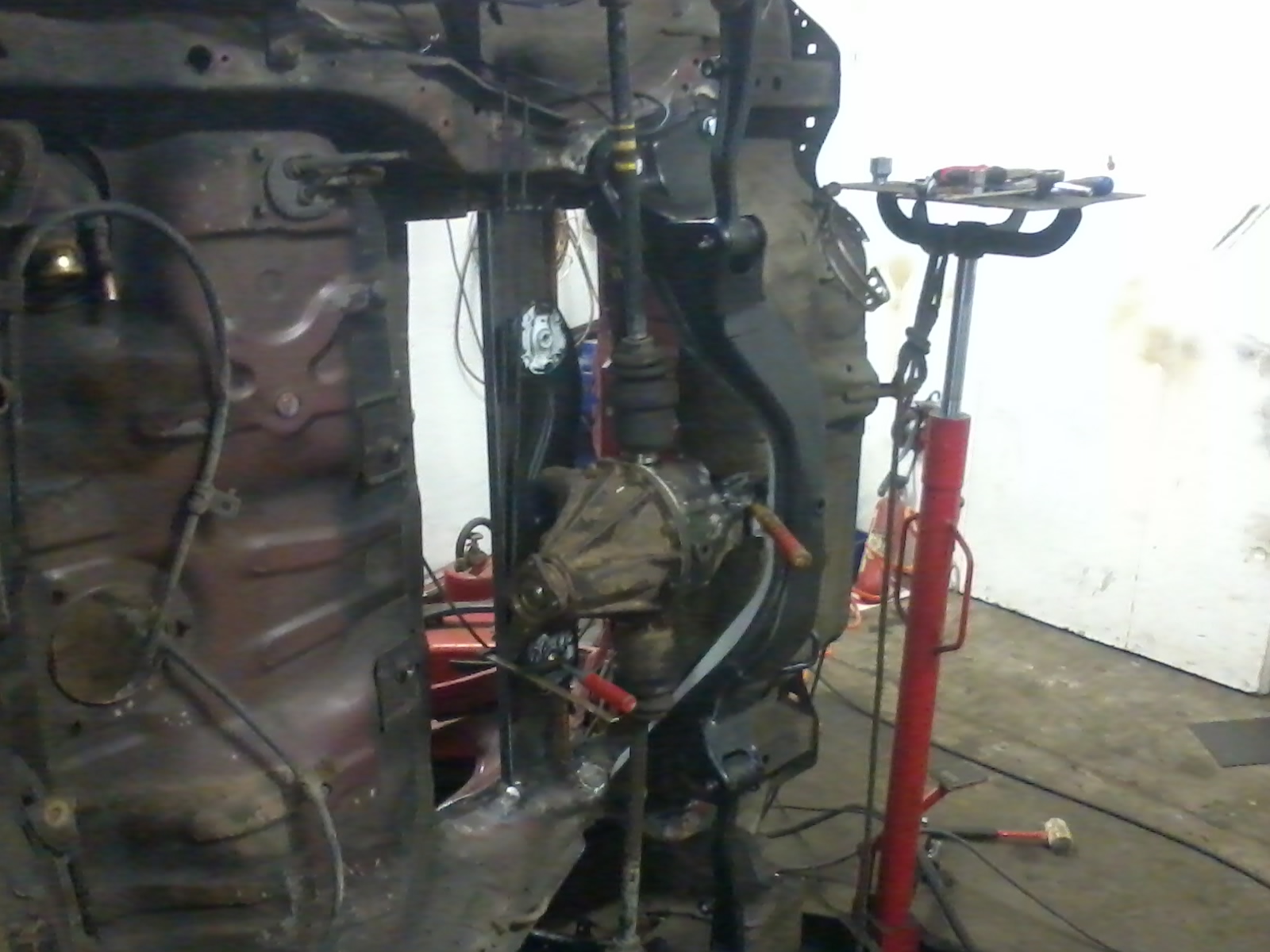 dnes jsem sel z prace driv a zadni naprava je tam. tedy jen na hrubo ale to je to nejdulezitejsi. Jen 2,5 hodiny mi trvalo umistit diferak do presne polohy aby byl presne ve prostred (to je teda blbost protoze on neni veprostred) no proste aby obe poloosy byli tak aby vyjizdeli tak jak maji a nevypadavali z kloubu. A take na rozdil od kolegy z HC jsem posunul dif o 6cm dozadeji (predelal jsem zadni drzak) a asi jeste nekde jsme se rozesli nebot budu muset kardan zkratit o 11cm kdezto on o 25 cm. Posunuti je patrne z fotky kdy poloosy jsou presne obracene proti honde shuttle kdy kola jsou v zadeji nez dif