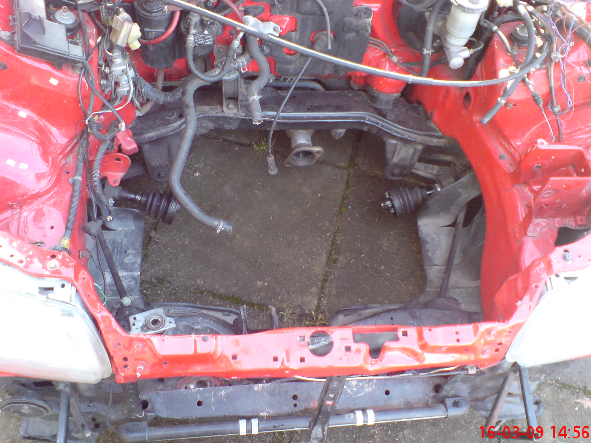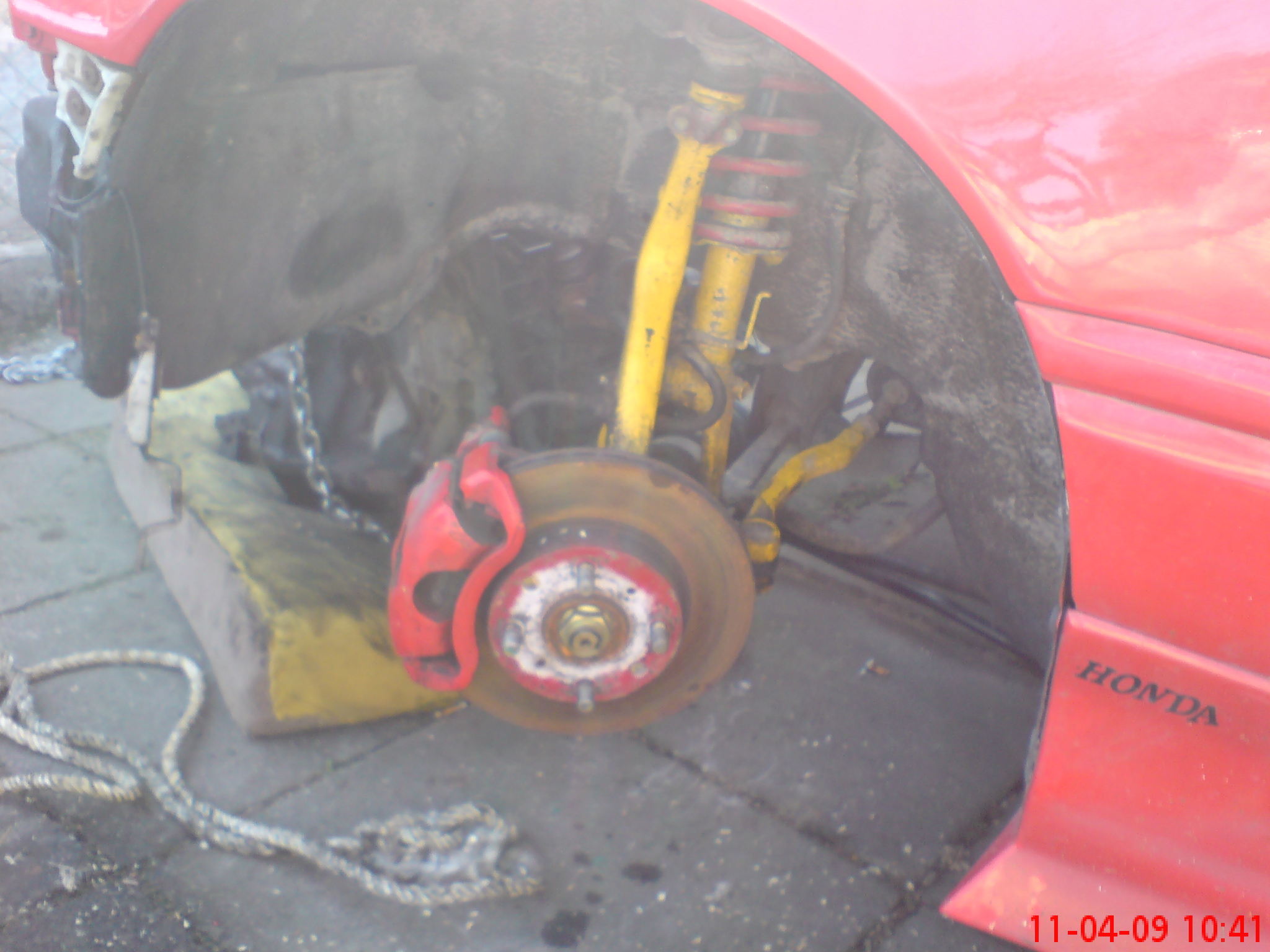 do pacova.Takto jsem poznal mooonwalkera,který mě nejprve svezl a pak mě nechal řídit.Byl to úžasná pocit,a crx si mě tím svým jízdním projevem získalo.Ale bohužel,pak nakonec neprodal to úžasně zachovalé crx,tak jsem hledál dál,a prostě nic zajímavýho dlouho pak nebylo nikde.Až se mi po čase ozval zas mooonwalker,a poslal mi odkaz kde byl inzerát.To crx mě hned zaujalo.Tak jsem vyrazil na obhlídku.Tentokráte k třešti,kde bylo crx schovaný pod plachtou v jedný malý vesnici.Podrobně jsem zkoukl stav,bylo tam bez motoru a pár věcí chybělo,ale nevím čím si mě tak získalo,asi tím,že nebylo seriový jak ty předtím co jsem měl možno vidět.Pár dní jsem přemýšlel a nakonec jsem si pro něj dojel s podvalem a odvezl jsem si ho na chalupu,kde mám vybavenou dílnu,věděl jsem ,že na něm bude spousta práce,ale přece jenom už jsem měl něco za sebou tak jsem do něj šel.Nejprv začal boj s scháněním vhodného motoru,v TP byl typ D16Z5,tak jsem začal schánět.Pro motor jsem si dojel do hradce králové,kde už byl vyndanej z černího crx,které už bylo bohužel rozřezaný,jen jsem viděl motor v běhu na videu,ale nabízel mi k němu spustu dalším dílu,tak jsem to risknul,a dobře jsem udělal.Když jsem nadšenej po dlouhé ceste na vysočinu dovezl na kárce motor s převodovkou,začal jsem plánovat,co vše na něm budu dělat a co je potřeba dát do kupy,aby mohlo vyjet do provozu.V provizorních podmínkách jsem začli s kamarádem radkem,plánovat jak tam nacpat motor,měli jsem tam jen "kočku" na zvedaní,tak jsme ztloukly "kozu"na to pověsili "kočku" na to na řetěz motor a ze zhora jsme ho tam pomalu pouštěli.Když byl na svém místě,nandali jsme poloosy,ramena,pak jsem vyhrabal elektroinstalaci,a začal vše zapojovat,což mě docela bavilo