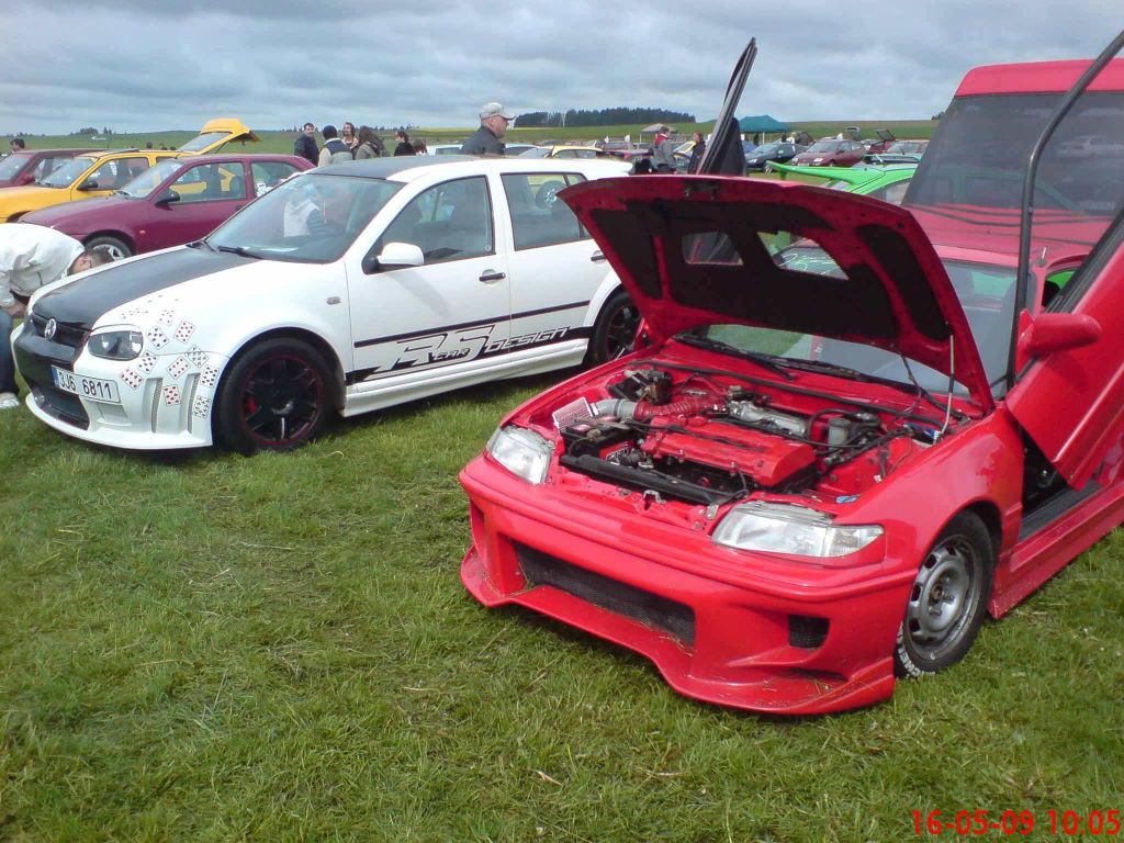 jakožto elektrikáře.asi za cca 14 dní bylo vše posehnáno co chybělo kolem motoru,elektriky,za občastných rád po telefonu minora a skřítka.Po řadě problémů s předělávním Konektorů na elektroinstalaci v autě bylo vše zapojeno a začlo zkoušení.Nejprv ještě s neorigo chladičem s fáčka,dolil jsem olej shell 10w40,destilku do chladiče a zkusil jsem otočit klíčkem v zapalování,chvilinku to trvalo ale naskočil,bez zadního dílu výfuku docela rachod po okolí chalupy. Nechal jsem ho ohřát a prvně jsem bez předního a zadního nárazníku,bez kapoty,vyjel ze dvora,a s burácením od zadu crx jsem vyjel vstříc kopci.Motor pěkně táhnul,ale zaujala mě ručička na teplotu motoru,která se začla rychle zvedat k červenému poli,proto jsem se radši vydal zpět.Hned mi bylo jasný,že ten chladič z fáčka na zkoušku není to pravé,proto jsem si dojel radši za skřítkem pro origo chladič na crx.Pak jsem ještě zkrátil koncovky výfuku,doladil otvírání lambo doors,nandal kapotu,kterou mi mírně zvedalo vysoké výko od rozvodů.Přiblížil se duben,a kvapem tuning sraz v j.hradci,kde jsem byl častým účastníkem,a já ještě neměl vše v cajku na crx.Tak mě naštěstí zachránil kamarád Alex a přijel pro crx se svým podvalem,tak jsem vyrazil cca 8 km na sraz s crx.Na místě už bylo mraky upravených aut a já se rázem stal středem pozornosti,když jsem seděl v crx a vezl se na podvalníku na plac