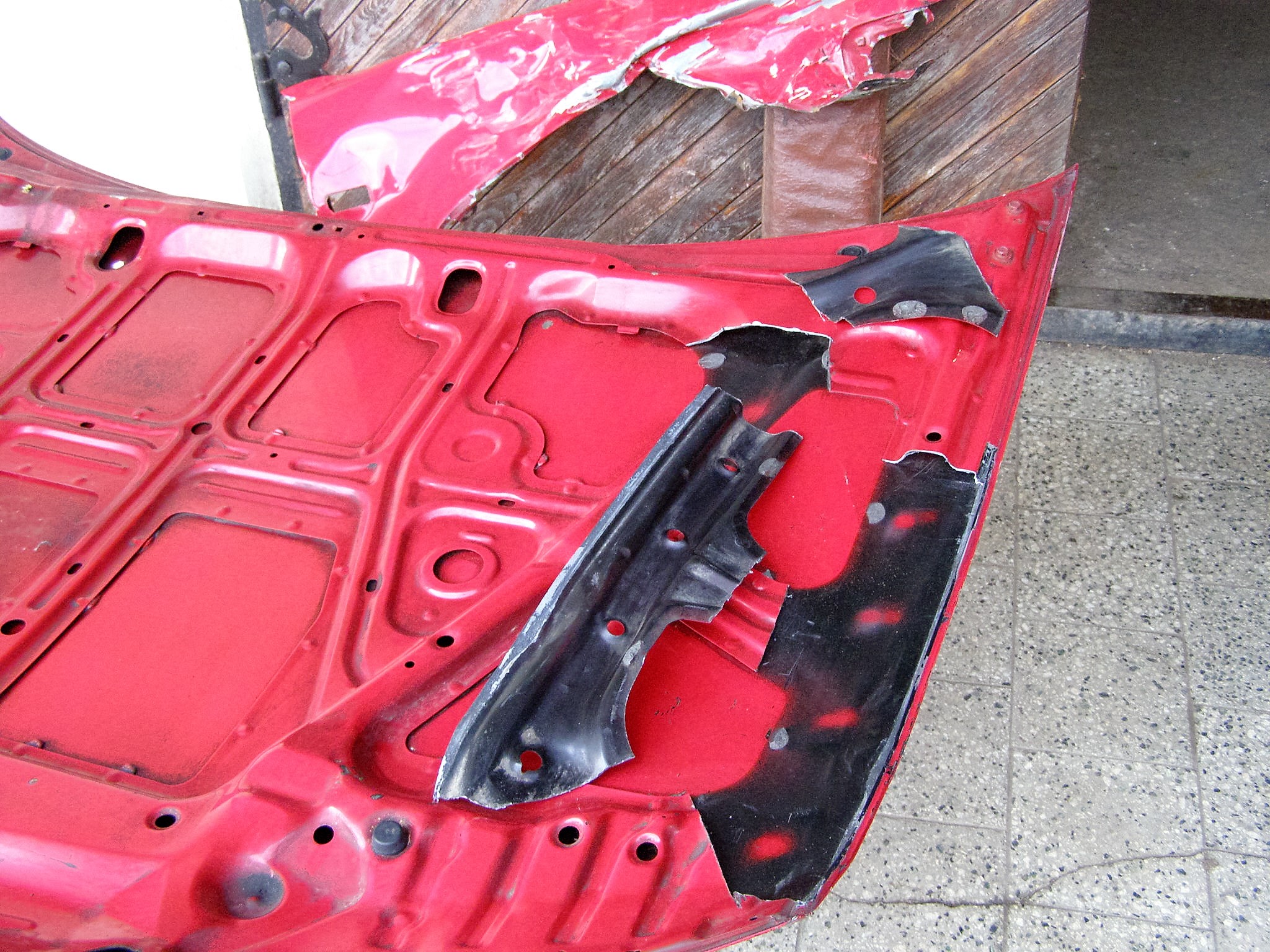 Tak se trochu pochlubím jak pokračuji v odstraňování následků nehody v Praze.Tak nárazník je na opravě odborník říkal,že to nebude žádný problém(že viděl horší).Jsem za to moc rád.Zatím vyklepávám části(držák nárazníku se podařil srovnat,Malé nerovnosti na PP blatníku taky a dal jsem se do opravy kapoty).Musel jsem vyříznout části výztuhy,abych mohl vyklepávat,krajní část kapoty byla zlomena do pravého ůhlu směrem dolů.Chci aby tam byla co nejmenší vrstva tmelu.