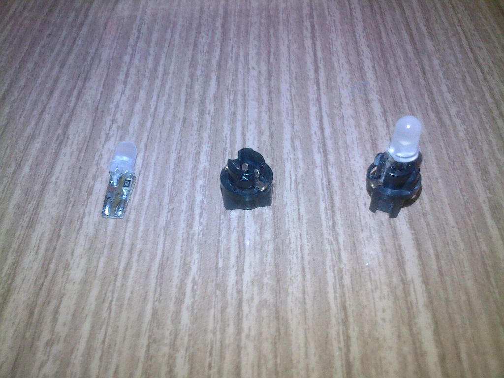 V pátek přišly objednaný LEDky, tak sem se pustil do výroby LED žárovek do přístrojovky. Prozatím sem udělal jen náhrady za žárovky kontrolek. Je to udělaný tak, aby LEDky šly z patic vytáhnout stějně jako origo žárovky.