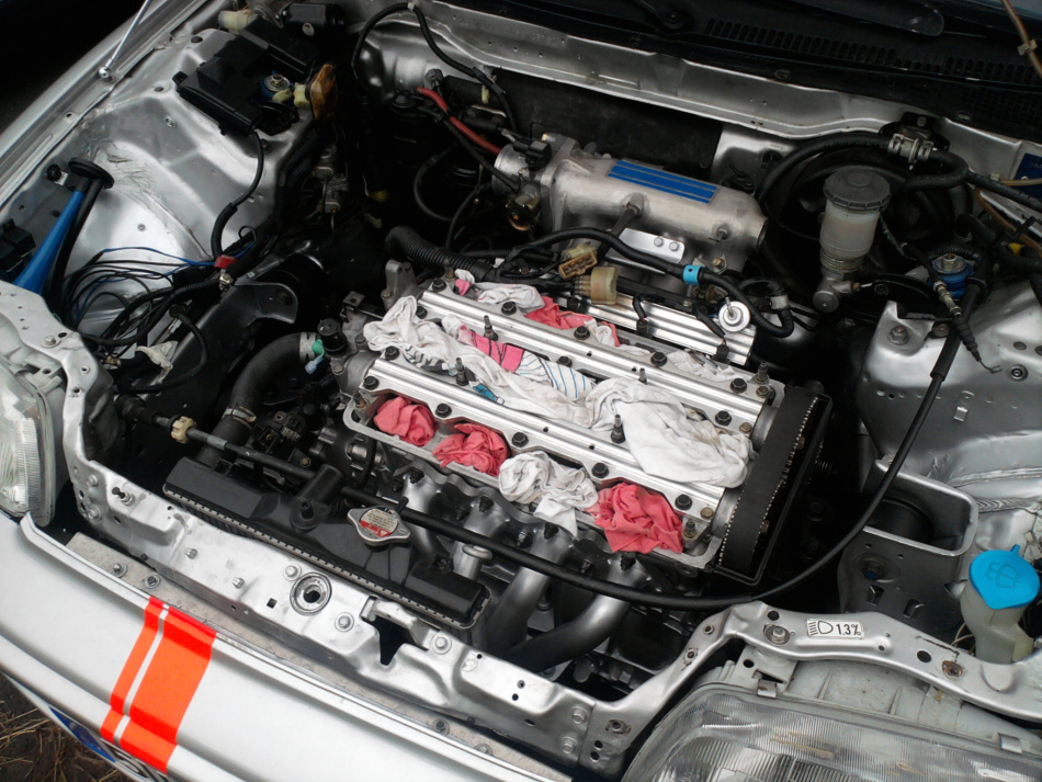 Tak dnešek probíhal celkem úspěšně motor opět několikrát dovnitř a zase pěkně ven, byl dodělán silentblok převodovky viz. foto, dále zadní držák motoru viz. foto. Dál jsme vyměnili homokinetické klouby na VTI poloosách za ED9, ale nejdřív jsme vyzkoušeli sundat ABS kroužek a pak i gumové těsněsnění z origo VTI homokinetických kloubů a takto upravené je umístit do brzdouvých kotoučů. Po dotažení hlavní matky na poloose se jaksi poloosa přestala otáčet, takže došlo k již zmíněné výměně kloubů. Poté jsme dali auto opět na kola tak, aby mohlo dojít ke kontrole, kde všude se to dotýká, vcelku to dopadlo dobře ( je to na milimetry