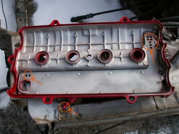 Nadešel den montáže a tudíž i avízované očisty. Vzal jsem pistoli a nádobku s technickým benzínem a jal se nečistoty vyplavit. Kompresor nafoukal 800kPa, co víc si přát. Po chvíli se ukázalo, že největší množství nečistot je zaneseno v prostoru pro odlučování oleje ze vzduchu, který předchází odvětrání ventilového rozvodu do sání.