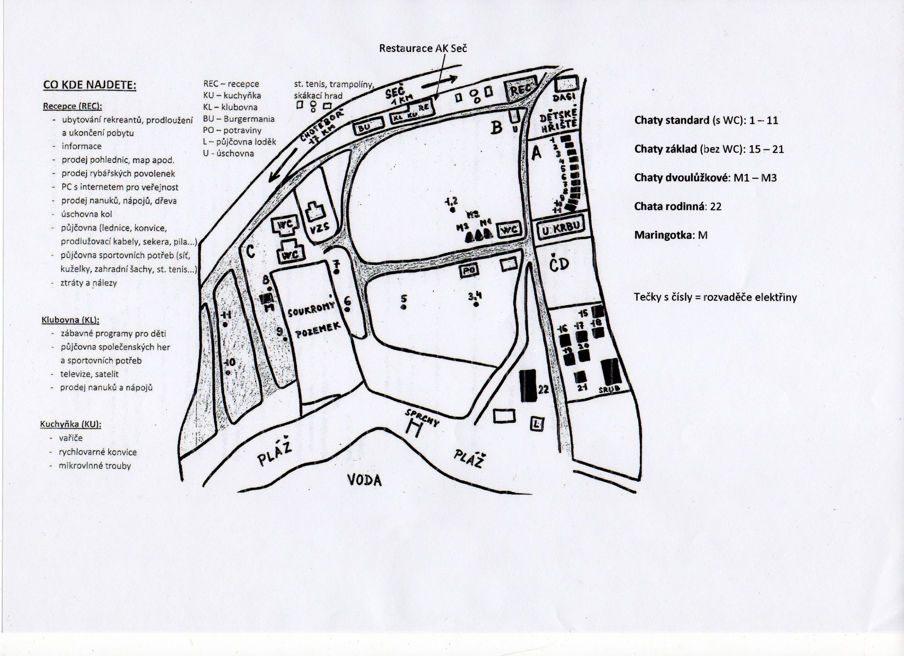 V příloze zasílám orientační plánek kempu. Jako plochu pro stanování a odstavení aut můžeme využít kteroukoli část sektoru B – dvoulůžkové chatky bez wc jsou přímo v tomto sektoru, čtyřlůžkové chatky s wc jsou ve dvou skupinách (1 – 11 a 15 – 21), vzdálenost je obdobná.