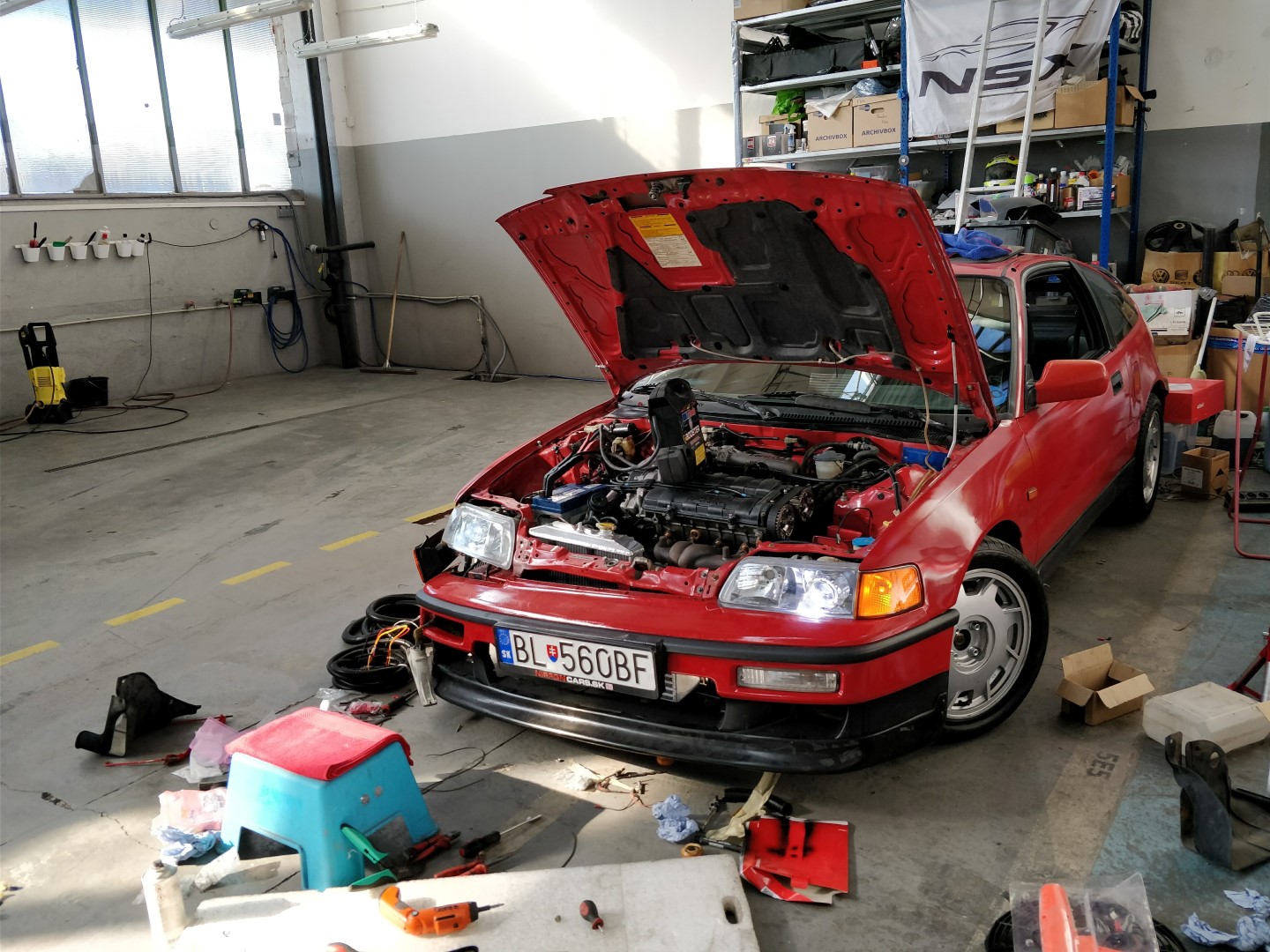 Auto preslo rukami este dvoch klampiarov aby sa dostalo do ako takej podoby. Medzitym, nakolko fuklo tesnenie pod hlavou, sa vybral motor, ze sa trosku upravi hlava, dame nizsie tesnenie aby boli vyssie kompresie, vyportuje sanie a tak, nech trosku dvihneme vykon. Vdaka mojmu velmi dobremu kamaratovi z HAKU Performance ktory rad vyhadzuje peniaze za funkcne blbosti sme sa rozhodli spravit komplet generalku motora. V polovici generalky si on postavil D16Z6 s kompresorom, celkom ma to zaujalo a nadchlo. Prehovoril ma nech to fuknem aj ja, chvilku (cca 10 minut) som sa branil tejto myslienke. Chcel som to po generalke zabehnut ako atmosferu, nech si to pekne sadne, nemal som ani tolko penazi a tak. Po tych desiatich minutach som uz pozeral na internete co stoja kovane ojnice. Prisli kovane ojnice, zistili sme ze potrebujeme ine piesty. Piesty som rovno kupil vybrusove takze zasa spravit vybrus a honovanie bloku a takto to slo dalej a dalej. Stale som vsak myslel ze to zabehneme ako atmosferu az potom kupime turbo a dorobime zvysok. Nie. Po kupeni nizsieho tesnenia pod hlavu by sme sa dostali na kompresie 10:1 takze zasa na zakazku prerobit tesnenie z 0.7mm na 2mm, kompresie su tym padom 9.1 pravdepodobne. Motor sa poskladal a dal do auta, samozrejme po roku sa stratilo asi 200 tisic srobikov tak nastali docasne provizorne riesenia ale je vnutri a drzi.