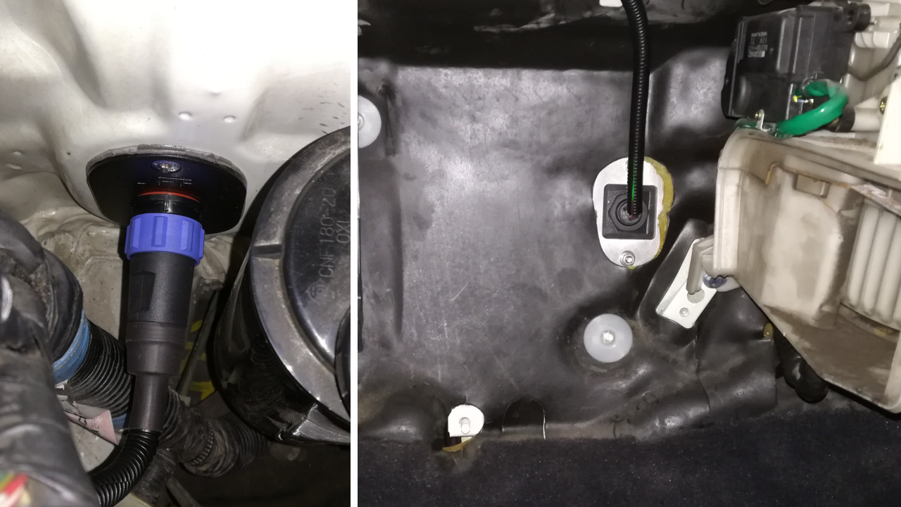 Zároveň sem namontoval svůj OLED zobrazovač MG-01XL. Pro snažší a rozebíratelnou montáž kabeláže k čidlům sem si vyrobil hliníkovou záslepku s 12 pinovým IP68 konektorem, která pasuje místo gumový záslepky a trubek klimatizace.