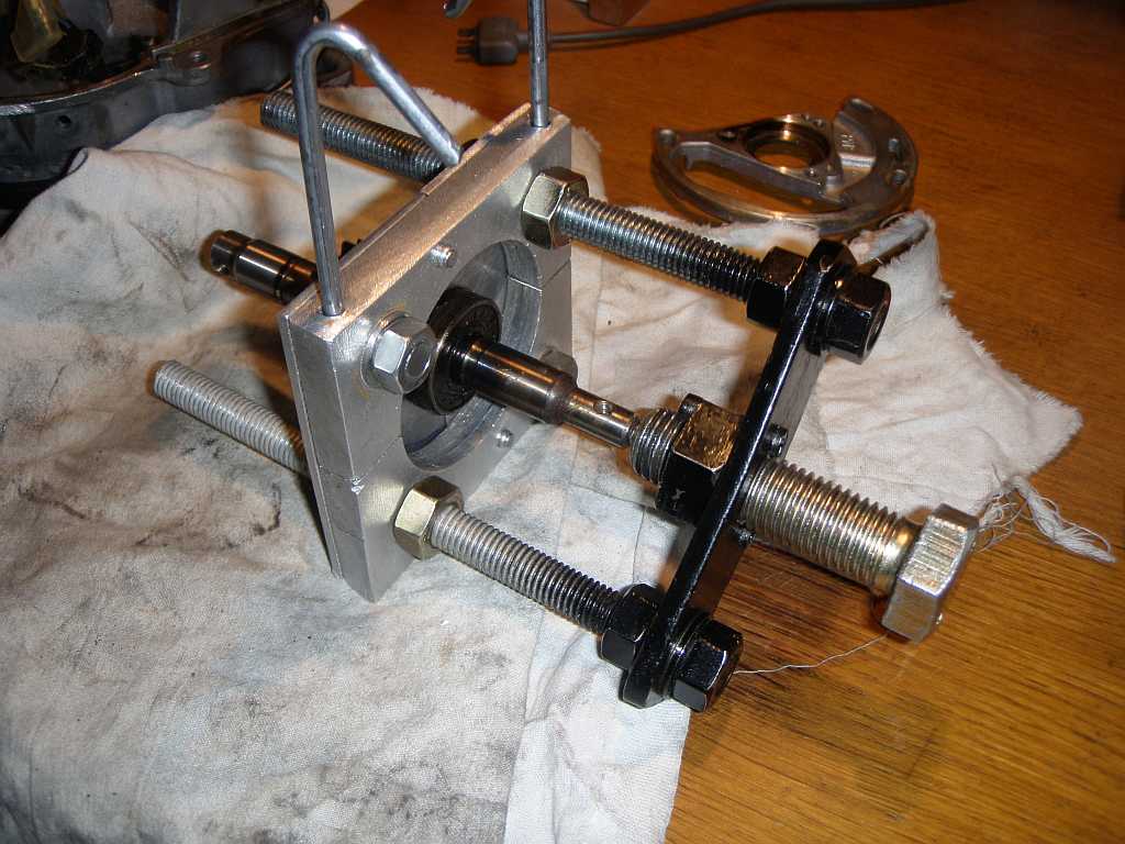 Na sundání ložiska potřebujeme stahovák. Ten, který jsem si koupil a který vidíte na fotce, vám bude úplně na nic. Naštěstí mám šikovného a ochotného kamaráda jménem Pako, který mi vyrobil stahovák ne tak vzhledný, ale o to funkčnější. Sundáme základní desku a ložisko stáhneme. Připravíme si nové (vnější průměr 28, vnitřní 12mm, výška 8mm) a kvůli snadnějšímu nalisování dáme hřídel na deset dvacet minut na mrazák.