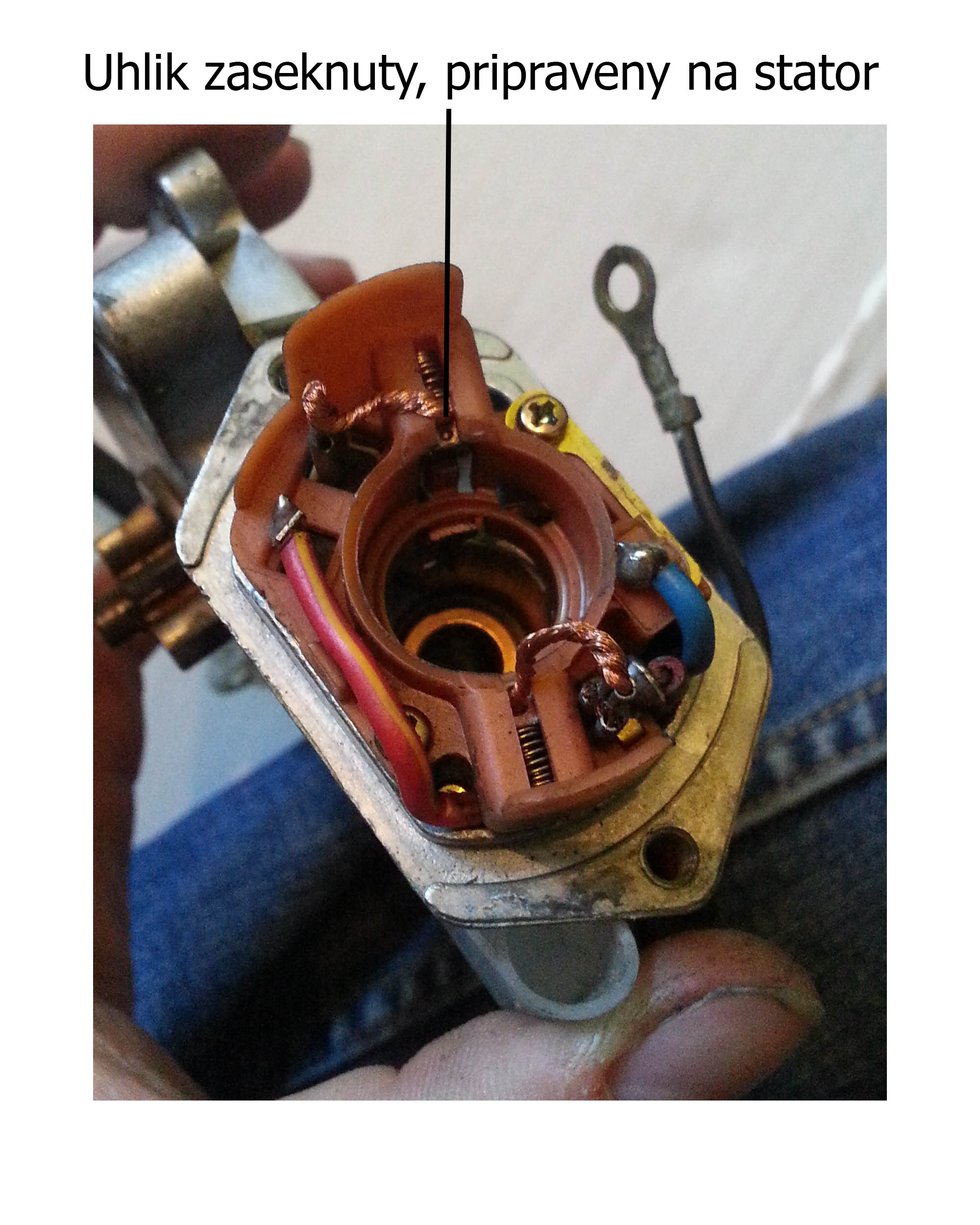 9. skladame naspat. Najtazsia cast je nacpat tam tie male uhliky ktore stale vyskakuju nakolko su tam za nimi pruzinky ktore ich tlacia k rotoru. To pochopite ked uvidite. Naspat ich davame tak ze ich zatlacime na ich miesto a na spodku je maly vybezok za ktory ich zachytime aby sa nevysunuli uplne. Po vlozeni rotora ich torsku posunieme, postrcime az kym sa nepritlacia pomocou pruziny k rotoru. A pozor na polaritu statora