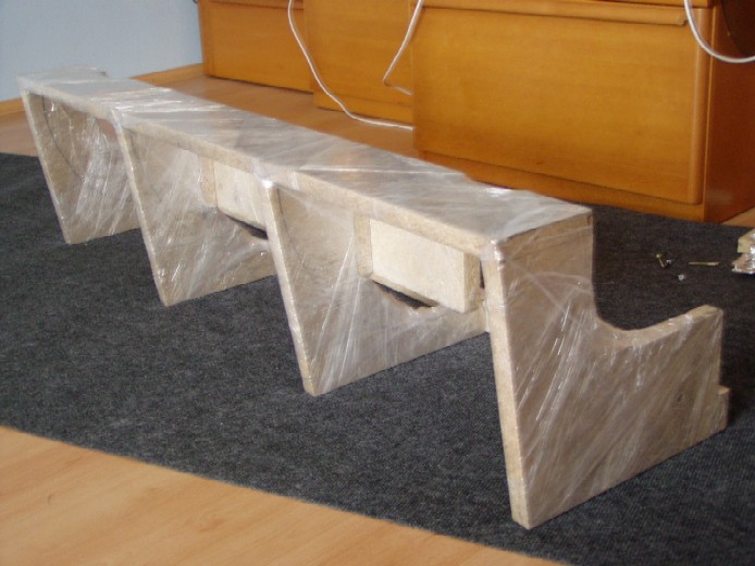 Finálnu verziu drevenej kostry som zabalil do potravinovej fólie (aby ju bolo možné po laminovaní vybrať) a začalo sa laminovať.