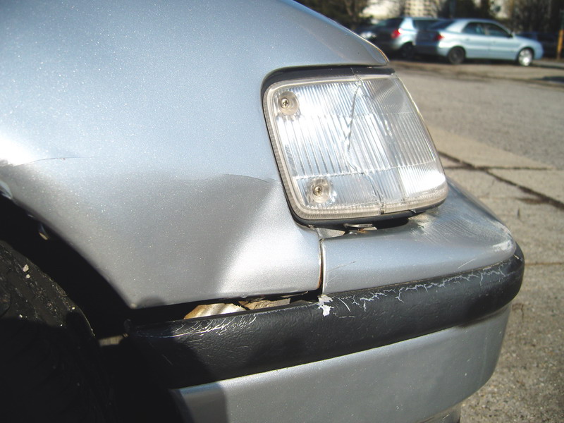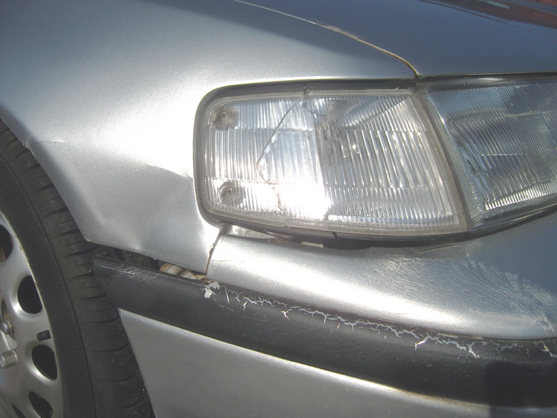 Popraskaná pozička, zlomený blatník (na foto už ako tak vyrovnaný rukou), moje už tak nudzové uchytenia nárazníku v ... a čo je najhoršie tie packy pozičky ten tlak vydržali a odtrhli kus okuliarov do ktorých zapadaju