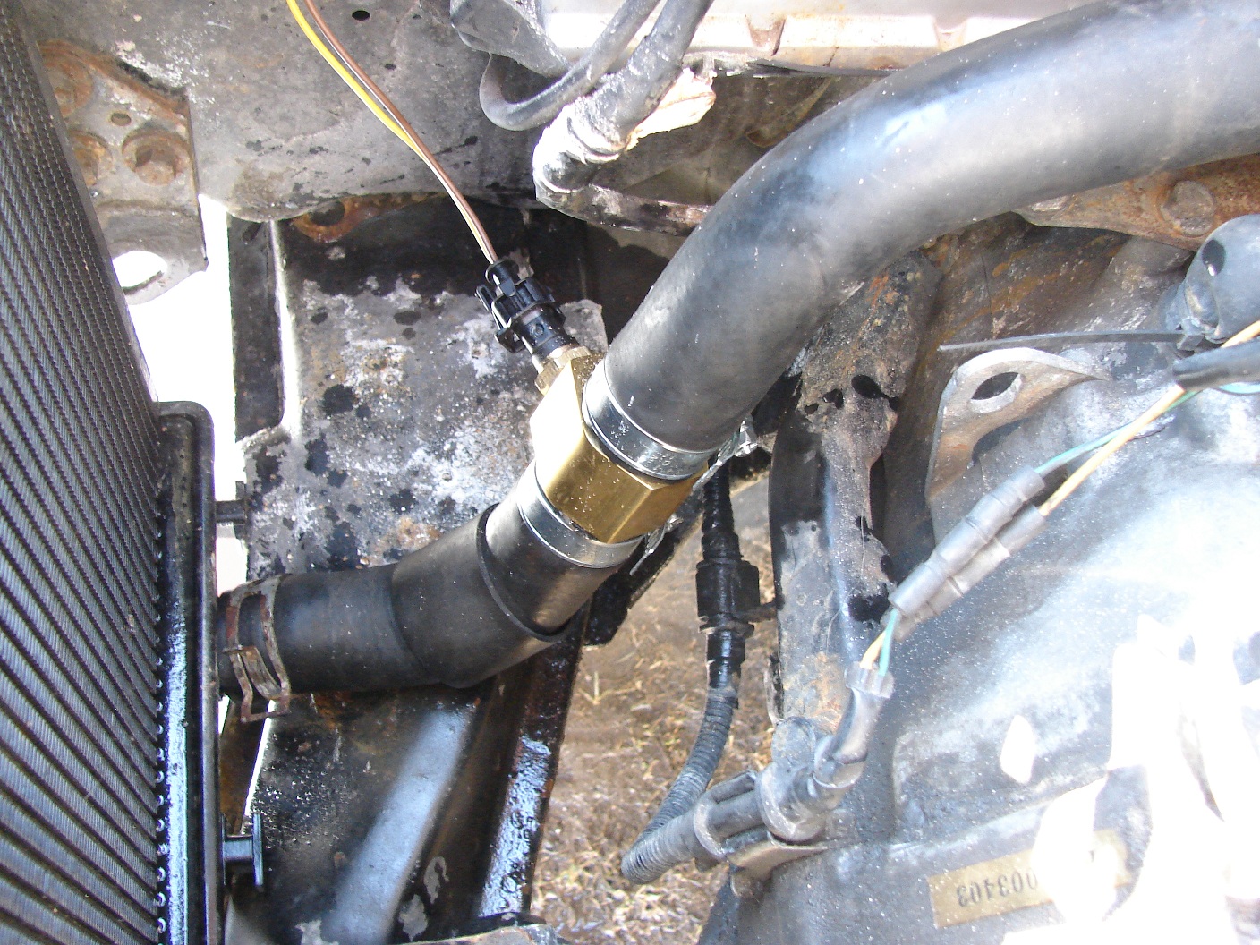 Takže se vypustila voda, rozřízla se přívodni hadice, z ní se kus odřízl a vložil se mezikus s čidlem.Dal jsem jej max 15cm od konce hadice u chladiče a nasměroval čidlo ke svazku drátů předních mlhovek s tím, že společně s ním povede i kabelaž od čidla.Dále jsem vypustil olej, odšrouboval filtr a začal s montáží sendviče.Tento mezikus je stáhnuty šroubem, který má na jednom konci vnitřní a na druhém venkovní závit.Takže se přidrží mezikus s těsněním a přitáhne koncem s vniřním zavitem.Jenže ouha, šroub na konci závitu a sendvič stále volny.Takže troška měřeni a rozhodnutí o zkrácení šroubu ze strany vnitřního závitu o 5mm to vyřešilo.Důkladně očistit, vyfoukat a zpět montovat...........aaaano zadařilo se.Ještě vymyslet natočení sendviče, aby nezavazelo čidlo, konečné dotahnutí a montáž nového filtru na venkovní závit.Tady bych dodal, že jsem doposud dával vždy jenom a pouze olej. filtr BOSH P2036, ale jeho venkovni průměr přesahoval o cca 5mm na každou stranu pres sendvič.Takže jsem zvolil trošku menší filtr BOSCH P2041.Nejspíš by to nedělalo neplechu, protože těsnící část je uplně stejná, ale takto vypadá líp a je i o neco kratší.Dále natáhnout ochranný "husí krk" za kabeláž, zapojit čidla a pustit se do spojování kabeláže.Nejsem žadný odborník, ale jistou představu jsem měl a po pár dotazech, zda to tak smím provést, jsem se do teho pustil.Zdroj i kostru jsem vzal u zapalovače, abych splnil podmínku-přívodu proudu až na zaplé zapalování.Vše bylo hotovo, takže zkouška.....k mému udivu se vše povedlo napoprvé a s vekým úžasem jsem sledoval oznamováni displeji.