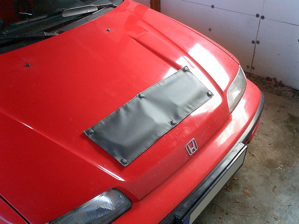 Včera jsem si z koženky sešil kryt na výdechy v kapotě, aby tam zbytečně nepršelo, když by bylo auto zaparkovaný někde venku na dešti. Po stranách je našitých 6 neodymových magnetů, takže to stačí jen přiložit na kapotu a je připevněno