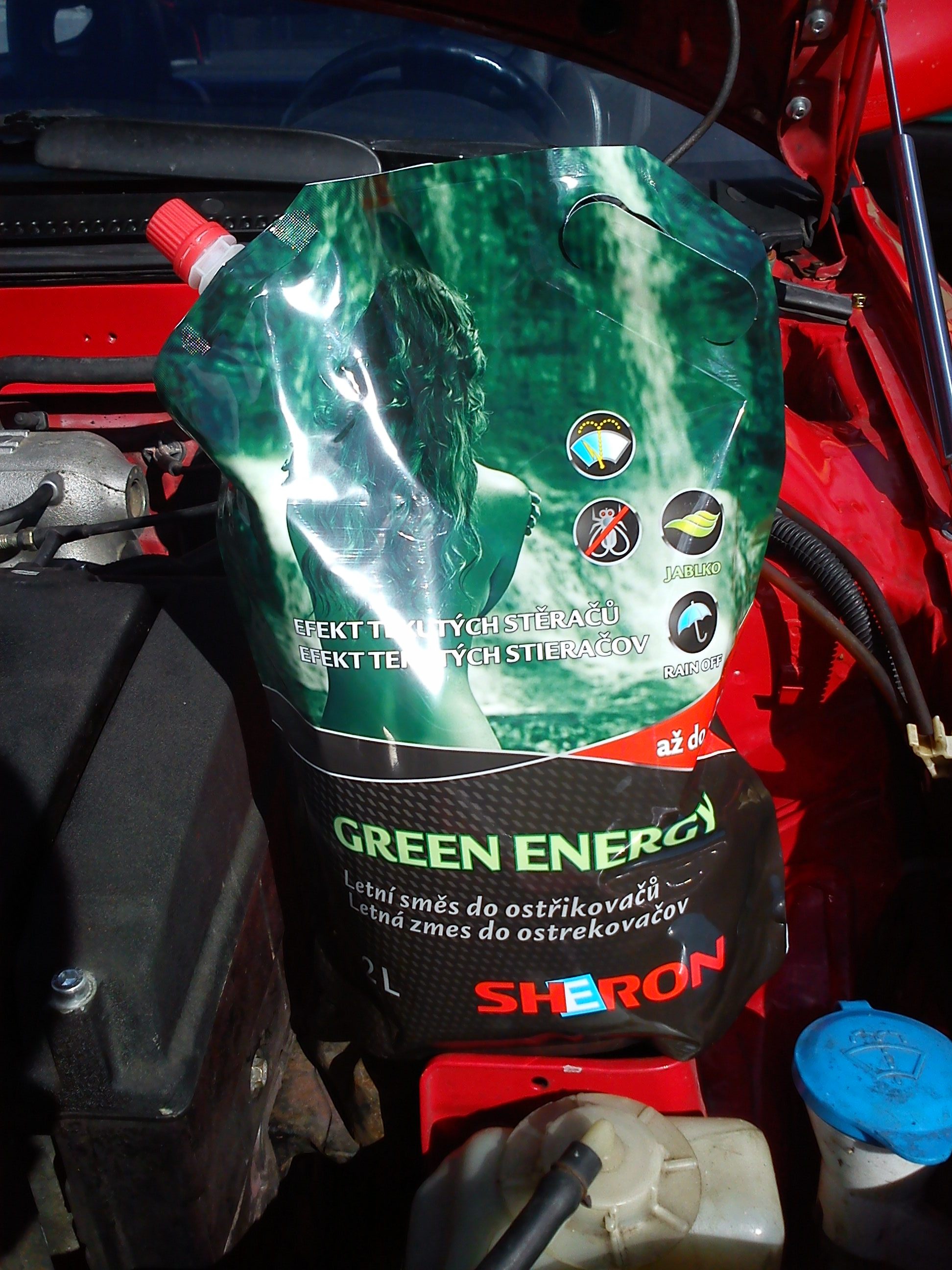 Vyčerpal vodu z ostřikovačů která tam byla, sice voněla jak pomeranče ale dělala děsně mastný fleky jak na skle tak na laku a jestli můžu tak bych určitě všem doporučil letní směs do ostřikovačů od SHERONU Green Energy, je sice poměrně drahá a nemá se ředit (2l cca 60Kč) ale mam jí odskoušenou a nádherně voní a hlavně perfektně funguje.