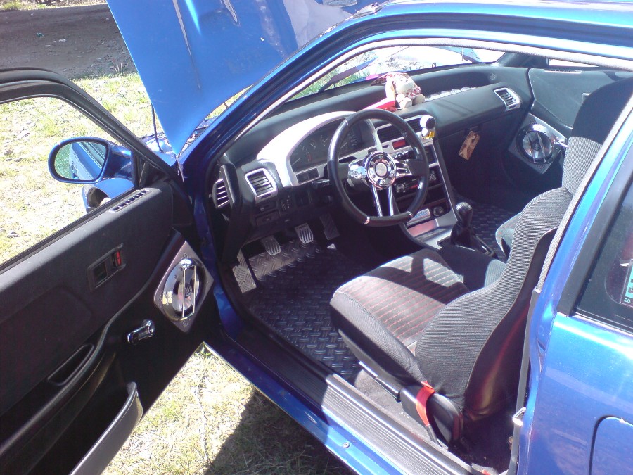 V interiéru sedačky LICO PROHEAD (neboli SPARCO CIRCUIT), short-shift, semišový velký volant, přídavný 12cm otáčkoměr se shift-lightem, zadní gauč pryč, místo něj jsem si vyrobil jinou podlahu. Autorádio, komponentní repráčky..spíš si poslechnu výfuk.