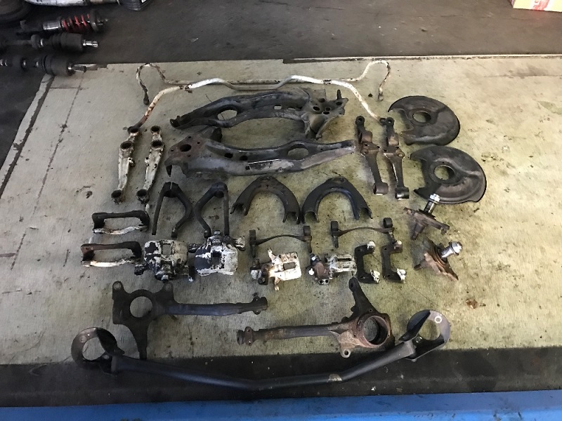 Skoro celé jsme to rozebrali, teď nám kolem auta leží hromada harampádí a my nevíme, co s tím a sraz se pomalu blíží. Samozřejmě si dělám srandu, ale původně to měla být jen výměna čepů a silentbloků, ale nějak se mám to zvrhlo a je z toho už měsíční kompletní renovace nejen podvozku.