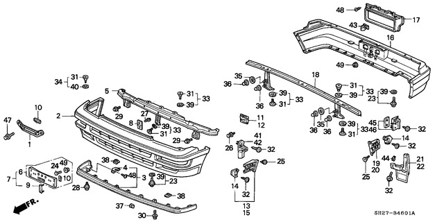 Abych to přiblížil je to pod předním světlem,jednou volnou ploškou(horní vodorovnou) je volně pod světlem,a svislá část tohoto úhelníku je přinýtována (plastovými příchytkami o průměru asi 6mm) čtyřmi k plechovému držáku nárazníku.Tento díl)Gumový)