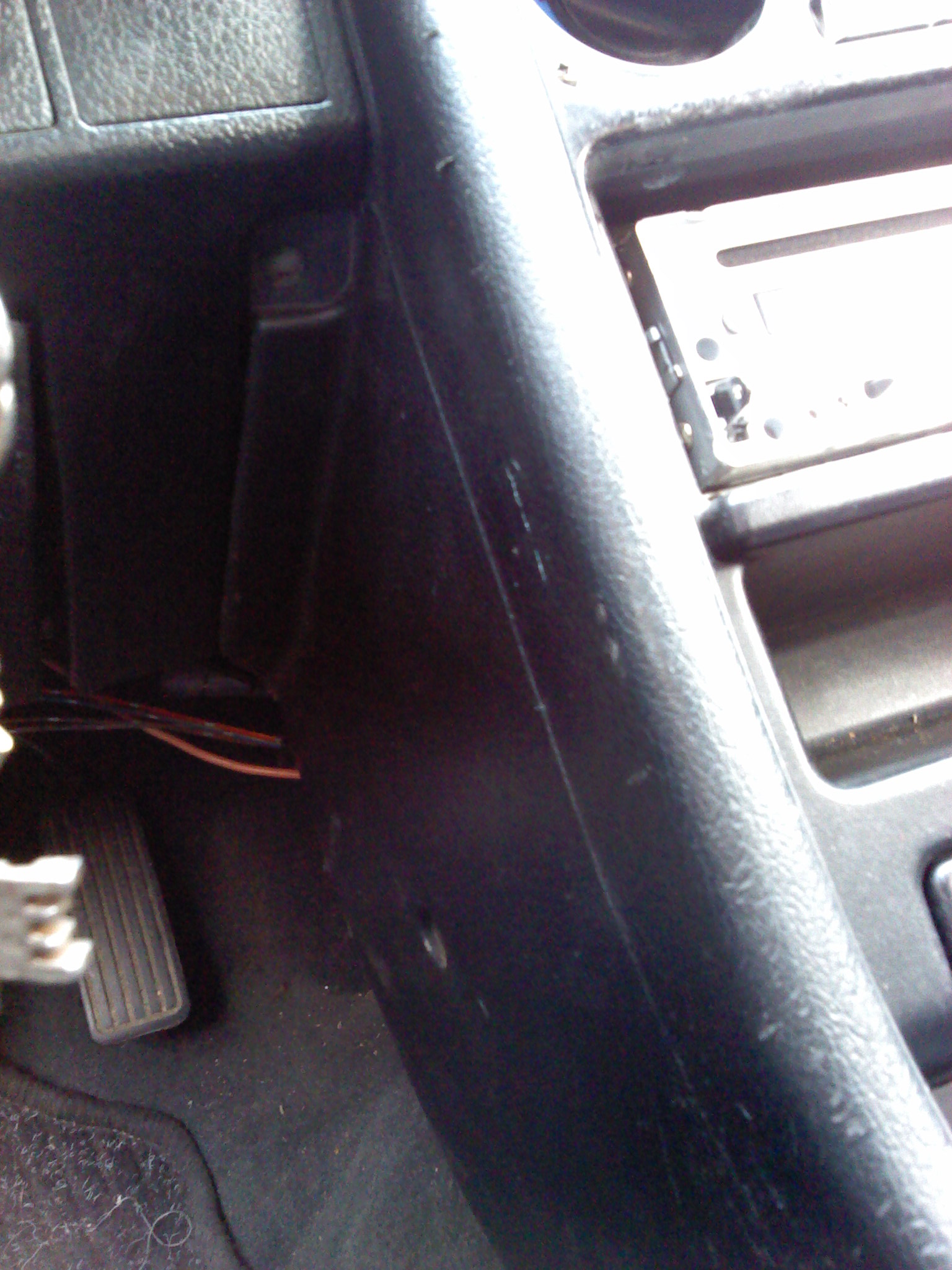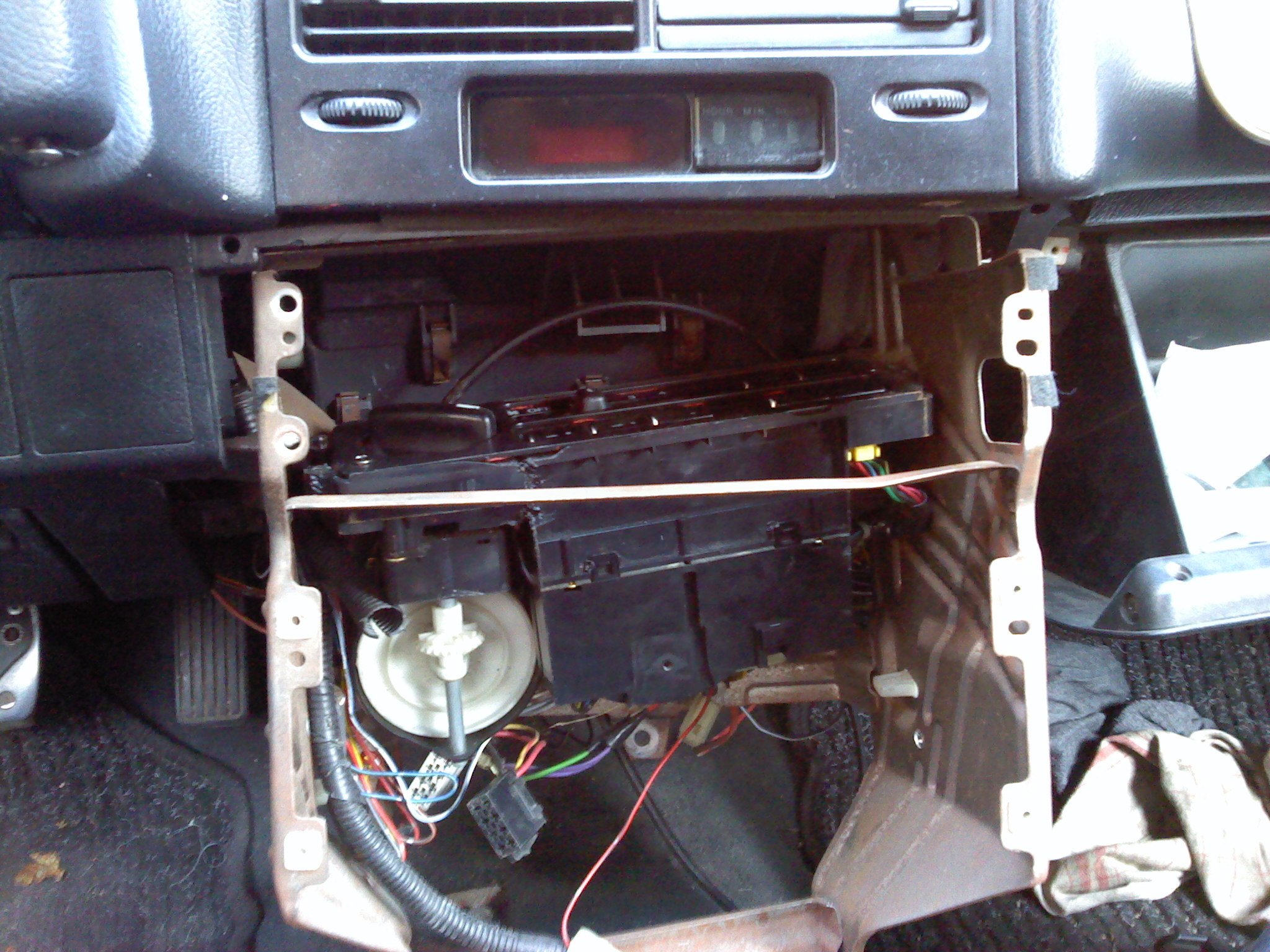 -Následně musíte vyndat celej ten kus kde je popelní i rádio a to povolením 4 šroubků,které na vás koukají,následně odpojíte kabeláž od rádia a popelníku a vyndáte z kovové konstukce. Nyní se na Vás usmívá celkem statečné množství místa a čeká na vyjádření Vaší fantazie jak se poperete s držáčkem panelu topení (je umístěn vzadu,zespoda panelu,je tam křížový šroubek) a doporučuji držák vyndat jeste před vyndáním panelu.