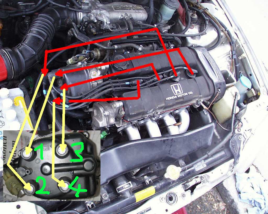 Kabel č. 1 patří (ne vždy, ale zde mluvíme o motoru crx DOHC, takže ostatní možnosti uvádět nebudu) do zdířky, která má u sebe označení C (v kroužku). Je to víceméně levý horní vývod, pokud se díváme na namontovaný rozdělovač jakoby seshora, na víčko s vývody. Kabely pak zapojujeme po chodu hodinových ručiček v pořadí 1-3-4-2 - viz obrázek.