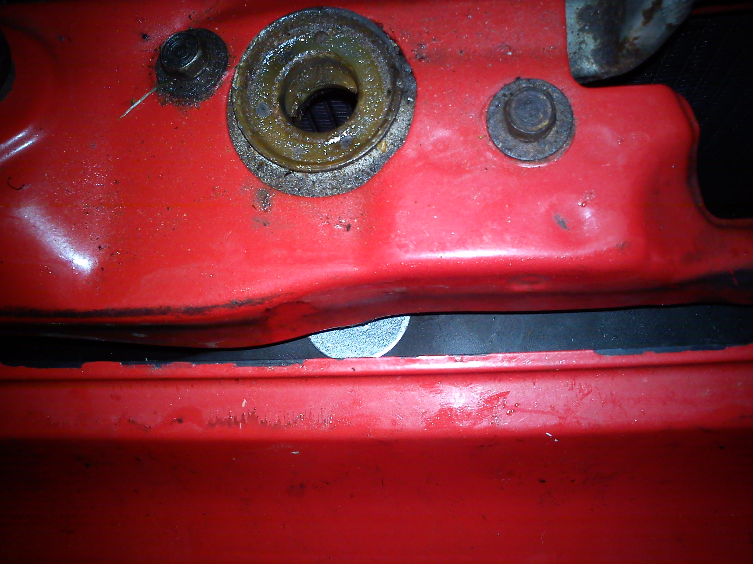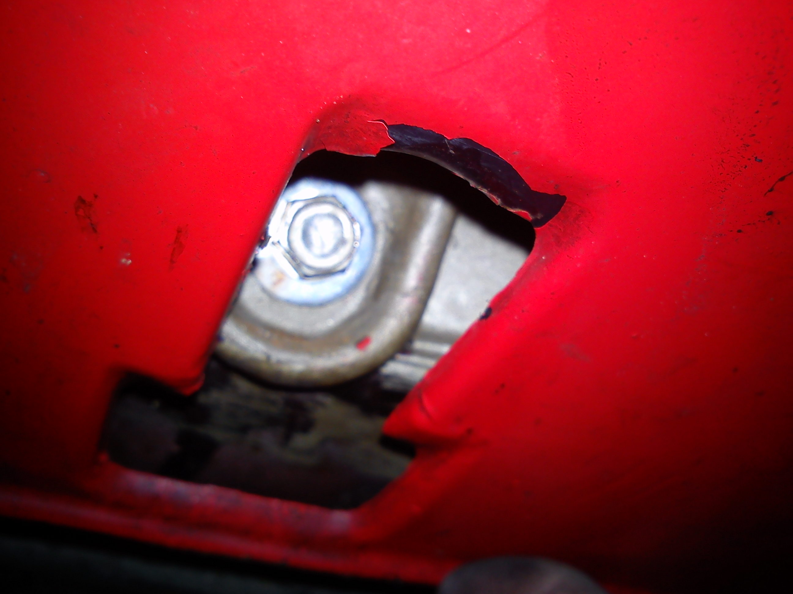 A k odmontování tří šroubů uprostřed z vrchu je potřeba odmontovat i plech se zámkem kapoty, který drží čtyři šrouby M6 nahoře viz foto č.1 a jeden M6 uprostřed dole v díře na nárazníku viz foto č.2.