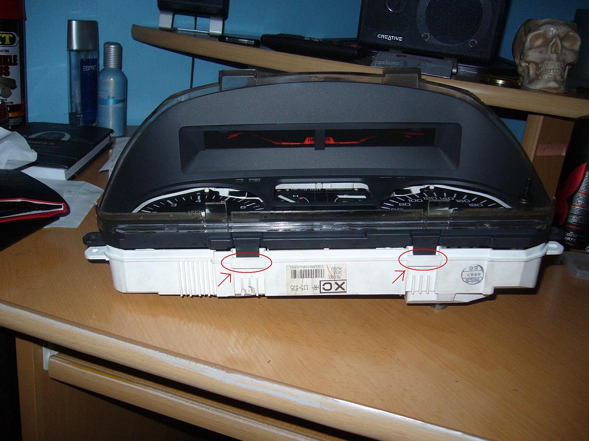 Tak prvně bych doporučil vymontovat budíky z auta (přímo v autě by se to montovalo asi dost blbě ) Jen upozorňuji, že na jiných autech se bude postup demontáže budíků trochu lišit, ale vždycky to najdete v manuálu), snad to popíšu dost jasně a nebudete muset hledat... Na céru se budíky vymontují následovně, musíte oddělat tu plastovou kapličku nad budíkama, drží ji čtyři křížové šroubky, dva jsou nahoře pod plastovýma záslepkama (záslepky vyloupnete plochým šroubovákem, doporučuji nějaký kratší, protože tam není moc místa, kvůli čelnímu oknu; ale pokud kvůli tomu vyříznete okno určitě to půjde lépe ). Potom vyšroubujete tyto dva šroubky nahoře a ještě nám zbývají dva dole, vpravo je jeden v místě kde je spínač výstražných světel, když se na ten plast kapličky podívate zespodu v tomto místě hned ho najdete a druhý je vlevo v místě spínače (vyhřívání skla). Teď odpojte spínače umístěné v kapličce a oddělejte celou kapličku stranou, doporučuji spustit si volant dolů, jde to pak lépe. Nyní potřebujete najít další čtyři křížové šroubky, které drží budíky v palubce, jsou po stranách, dva na levé straně a dva na pravé, pokud budete pracovat při dobrém světle nemůžete je přehlídnout, jenom rada dole jsou po stranách šrouby čtyři, dva vlevo a dva vpravo, ale vyšroubujete jen ty co drží plast budíků, já jsem vyšrouboval i ty další dva co jsou v plechu a bylo to zbytečný, ale navíc se pak dost blbě dávaly zpátky, takže ty bych doporučil tam nechat Teď když jsou budíky volné tak odpojte konektory, které do nich vedou, je tam vždycky taková pojistka kterou je potřeba zmáčknout a pak už stačí zatáhnout a je to! Ještě nám tam zůstalo lanko náhon k tachometru, to má taky plastovou pojistku, kterou zmáčknete a pak stačí lanko vytáhnout. A budíky máme venku z auta.