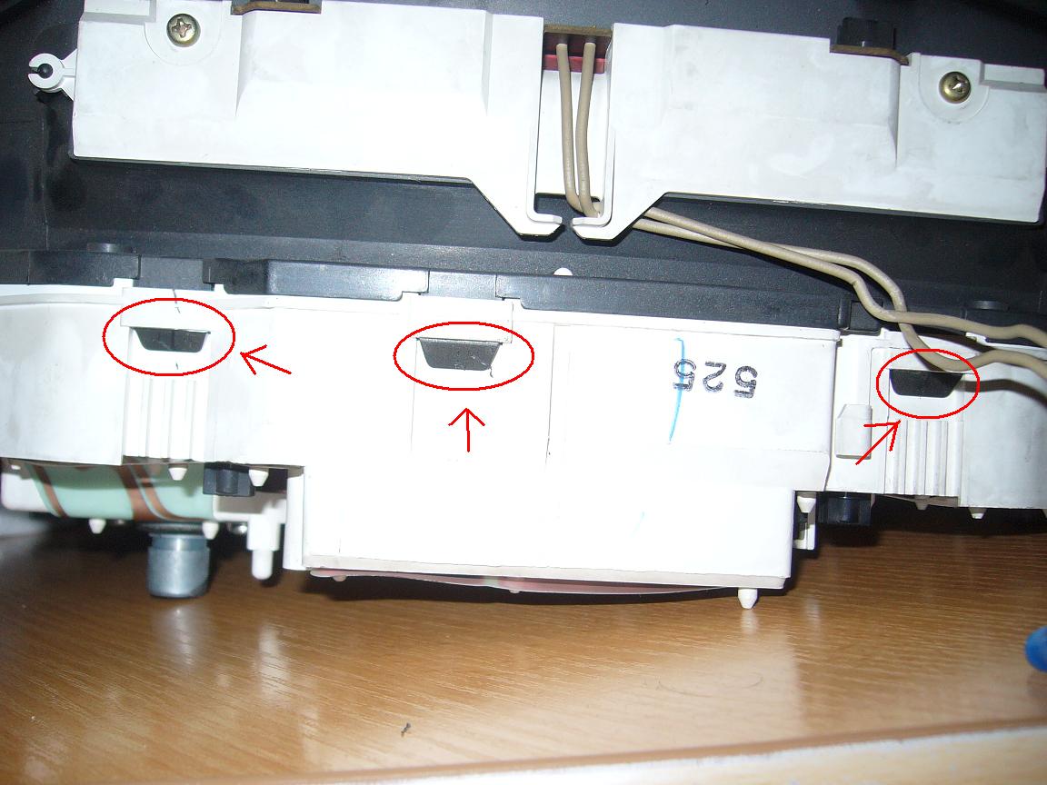 ...které je potřeba zamáčknout a poté plast oddělat, jde to udělat tak že vždycky jedním šroubovákem zamáčknete tu plastvou packu a druhým páčite ten plast, ale opatrně ať ho nezlomíte, šlo to lépe, když jsem začal těma dvěma co jsou dole, pak už šly lehce i ty ostatní. Dál je potřeba odpojit podsvit tohoto plastovýho krytu, z tohoto plastu vedou dozadu na budíky dva drátky, ty vyndáte z těch plastových držáčků...