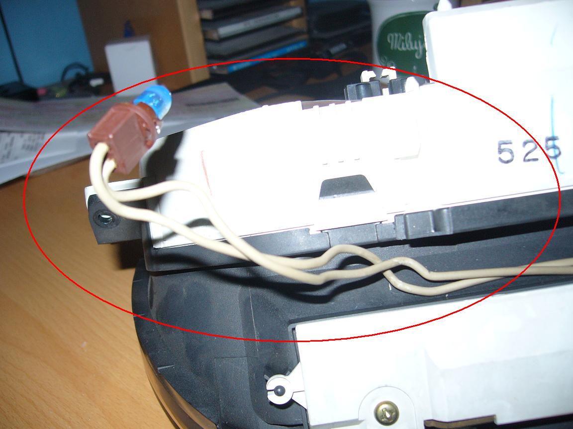 ...tak je potřeba ty kontakty ohnout. Já je ohnul skoro do pravého úhlu a nic se nezlomilo. Dole už plast půjde nasadit ale pořád tady máme dráty otáčkoměru a tachometru, natáhnete je po stranách, pod původním podkladem otáčkoměru a tachometru, pokud máte dráty už natažené až nahoru k ukazateli paliva a teploty, tak vemte nůž a vyříznětě v místě kde vychází dráty z indigo podsvitu teploty a paliva, malou dírku, ale ne zase moc jen aby se tam vešly všechny dráty i tachometru a otáčkoměru, budete muset řezat i do toho (černého) krycího plastu, který jsme na začátku daly stranou, pokud máte v obou dílech už dostatečnou díru na to aby tam prošly všechny dráty, můžete tento krycí plast nacvaknout zpátky, hotové to vypadá...