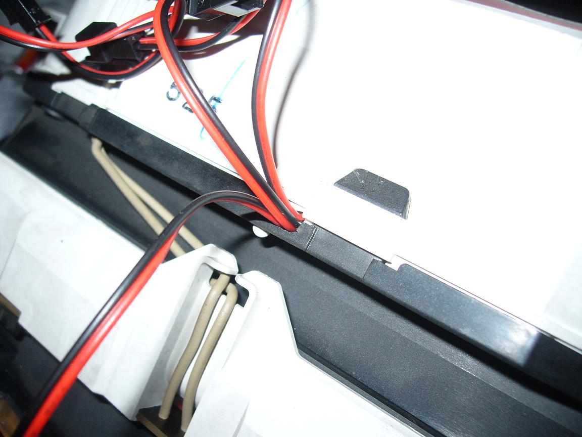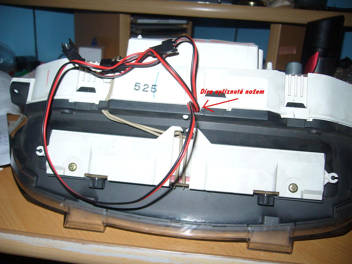 Teď, potřebujete nějak protáhnout dráty, který trčí do všech stran. Já zvolil cestu nejmenšího odporu a než abych řezal tři díry, tak stačila nakonec jedna. Jelikož připojení těch drátů do podsvitu trčí přes plast budíků a nedalo by se to složit...